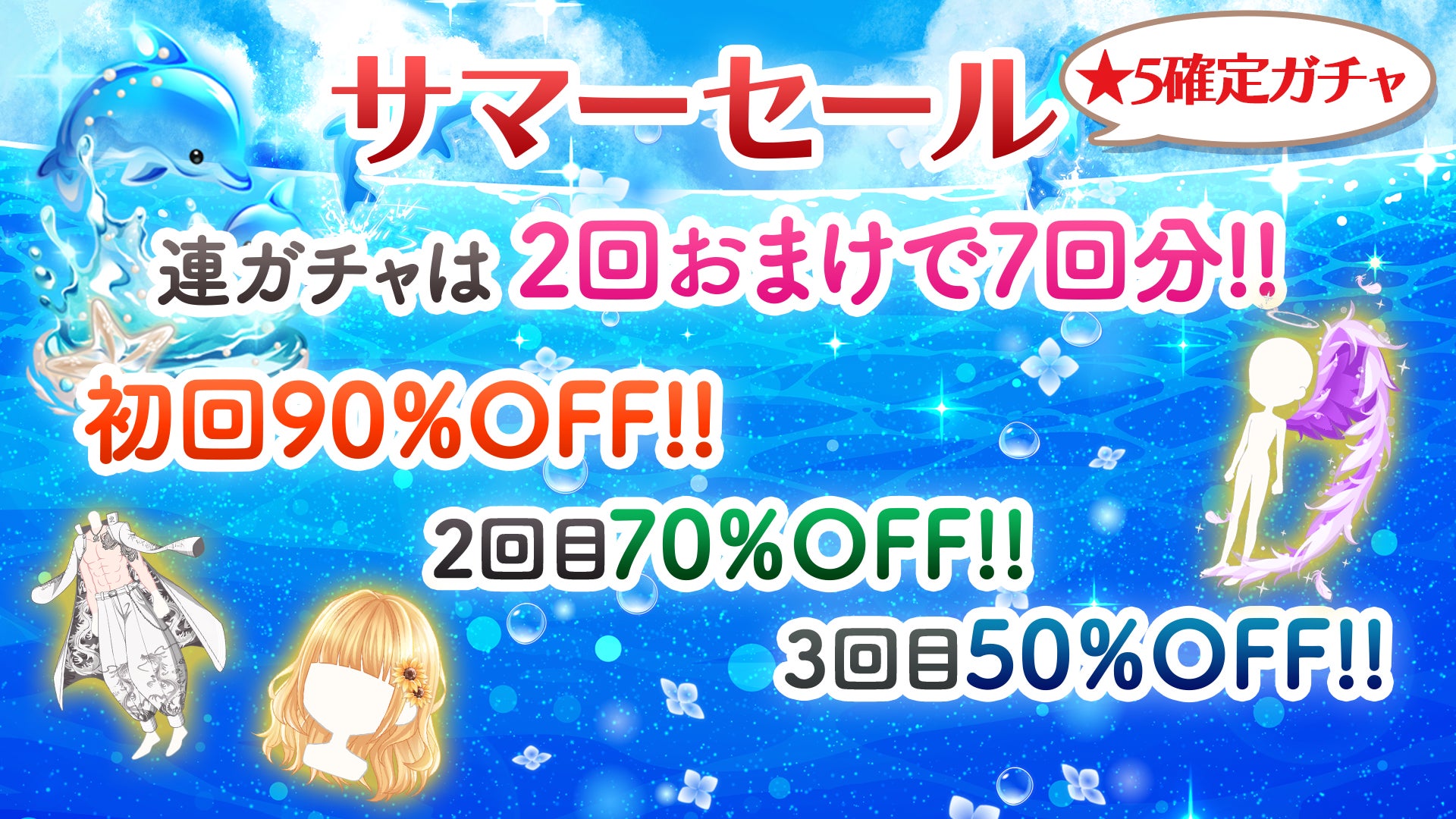 期間中の★5確定ガチャでサマーセールを実施しています。連ガチャが2回おまけで7回分、初回は90%OFFでセール期間中はガチャをまわすことができます。