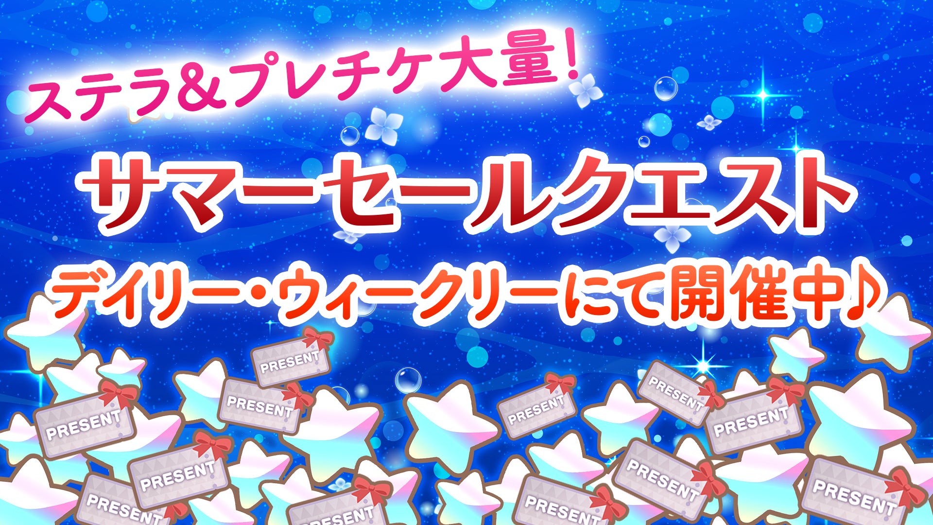 サマーセール期間中、ステラ購入クエストを追加で特別開催しております。通常のクエストも開催しておりますので、合わせて報酬をお受け取りください。