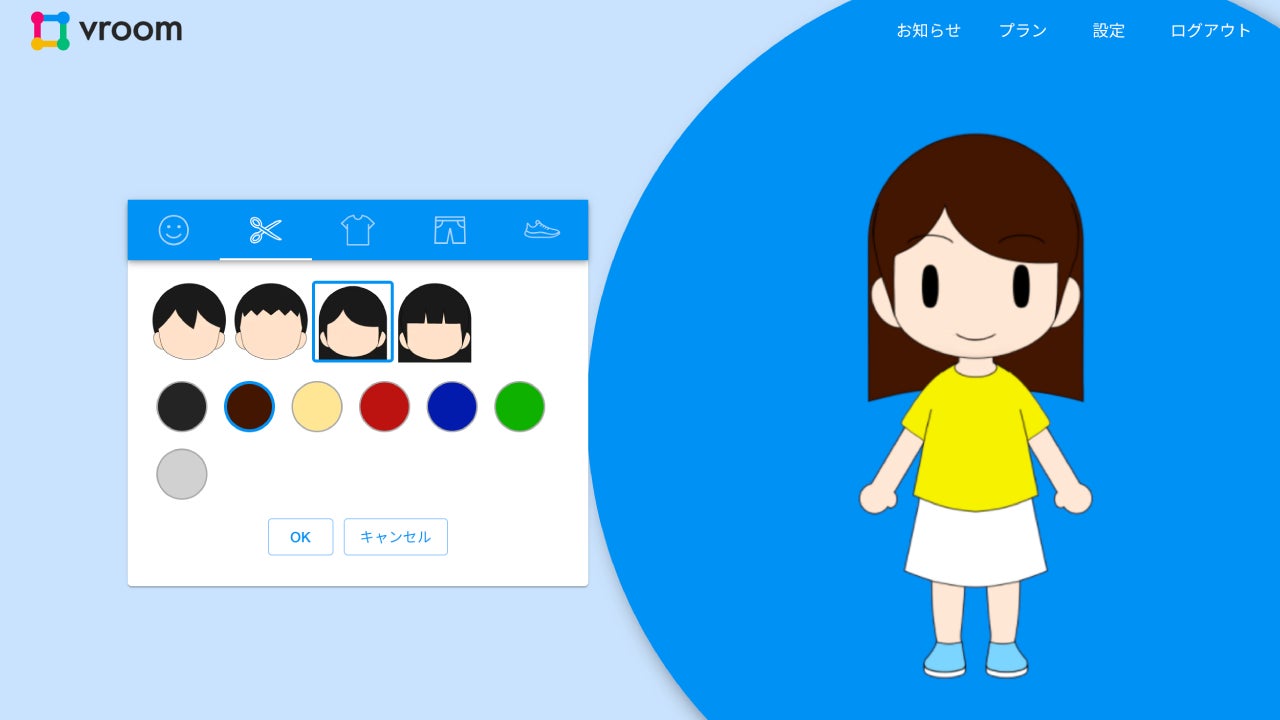 「vroom」では数種類の髪型や服装からアバターをカスタマイズをすることができます。ユーザーがアバターを用意する必要がなく、簡単にアバターを作成いただけます。