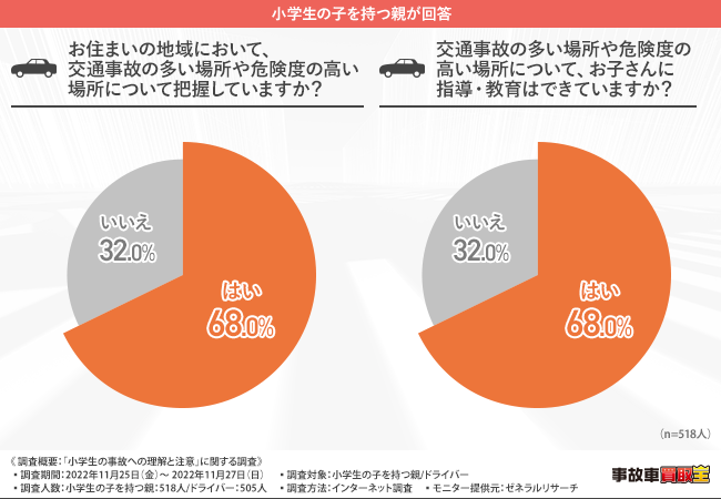 そこで、「お住まいの地域において、交通事故の多い場所や危険度の高い場所について把握していますか?」と質問したところ、7割近くの方が『はい(68.0%)』と回答しました。
