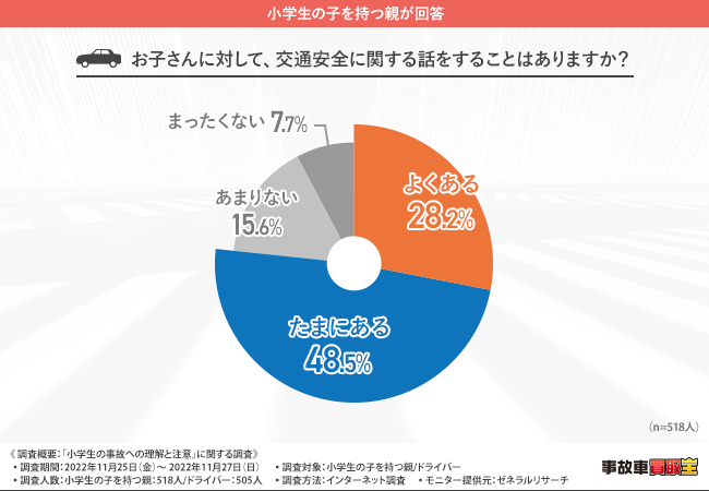 「お子さんに対して、交通安全に関する話をすることはありますか?」と質問したところ、『よくある(28.2%)』『たまにある(48.5%)』『あまりない(15.6%)』『まったくない(7.7%)』という回答結果になりました。