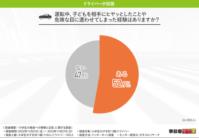 続いて、「運転中、子どもを相手にヒヤッとしたことや危険な目に遭わせてしまった経験はありますか?」と質問したところ、5割を超える方が『ある(52.9%)』と回答しました。