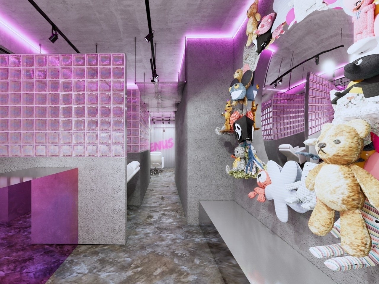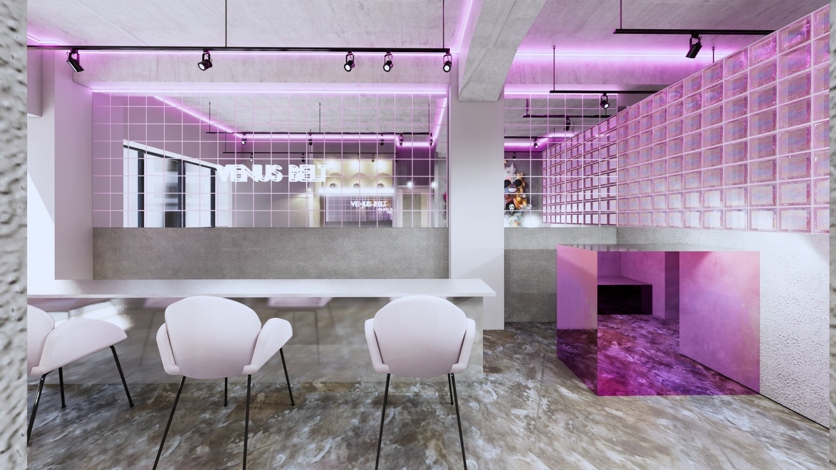 店内は、無骨な素材感とツヤのあるガラスブロックやミラーが融合し、異なる素材が交わる近未来的な空間を演出しています。ピンクの間接照明がアクセントとなり、待合スペースや店内には写真映えするスポットを設け、遊び心が詰まったデザインとなっています。