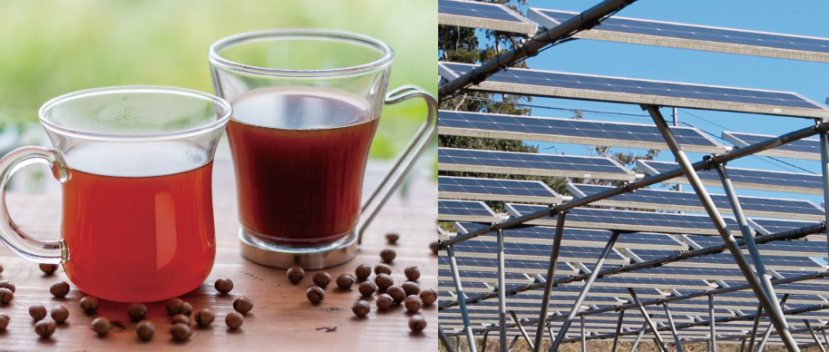 「太陽光パネルの元で育った大豆コーヒー」は、太陽光パネルの元で発電しながら作ったオーガニックな地大豆を使用していて、もちろんカフェインフリー。障害者の方と協働してコーヒーに仕上げています。