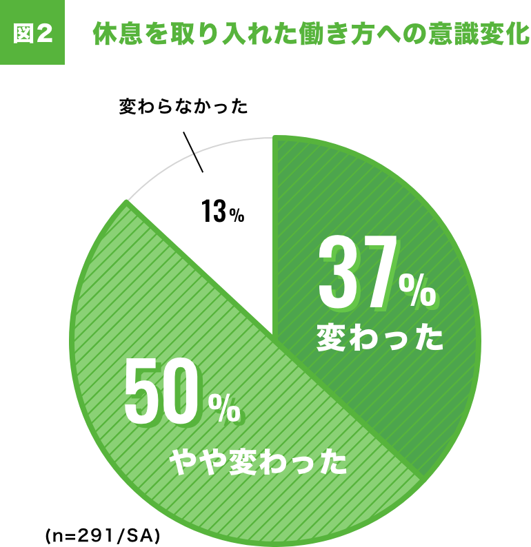 「オフィスめぐりズム」の導入により、87%(※)の方に休息を取り入れた働き方への意識の高まりがあり(図2)「適度なリラックスの重要性を実感した」などの声から、ワークタイムにおける“ちょっとした休息”の重要性を意識する契機となっていることが見受けられました。