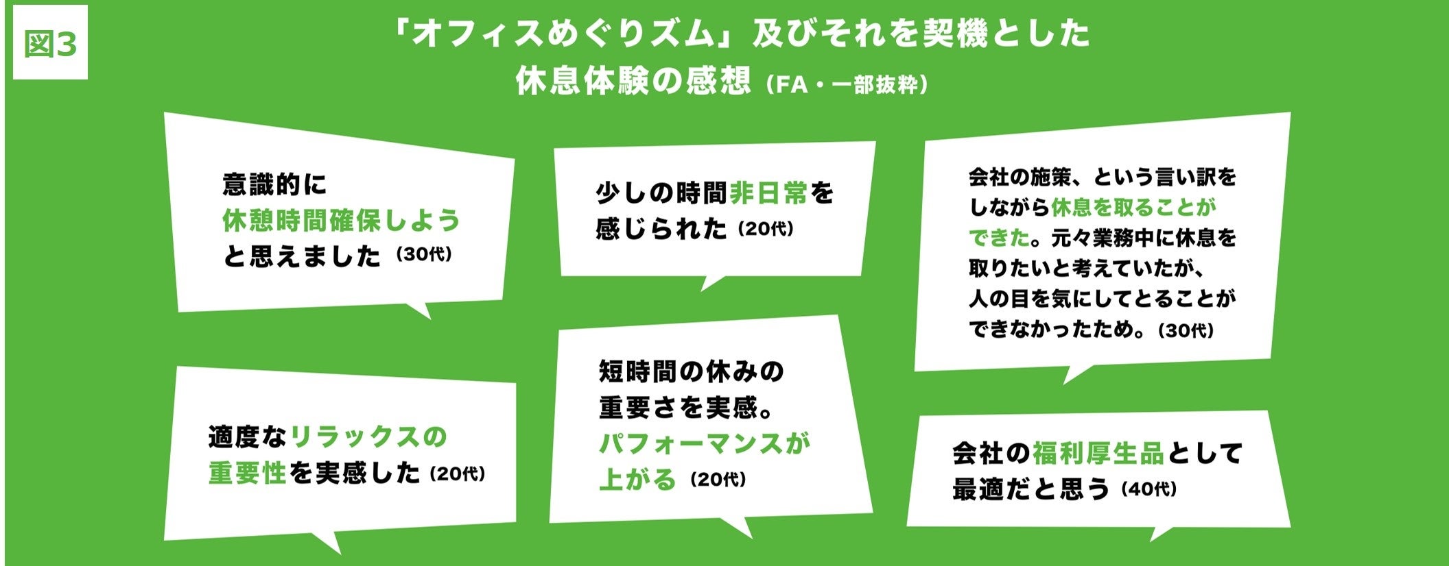 さらに、「休息した後はポジティブな気持ちで過ごせた」「プラスαで休むことで特別感を感じ、仕事との区切りがはっきりした」というコメントがあるなど、「オフィスめぐりズム」をきっかけに「自分らしい休み方」を取り入れることや、働き方に対する前向きな考えに作用していることが伺えました。(図3)