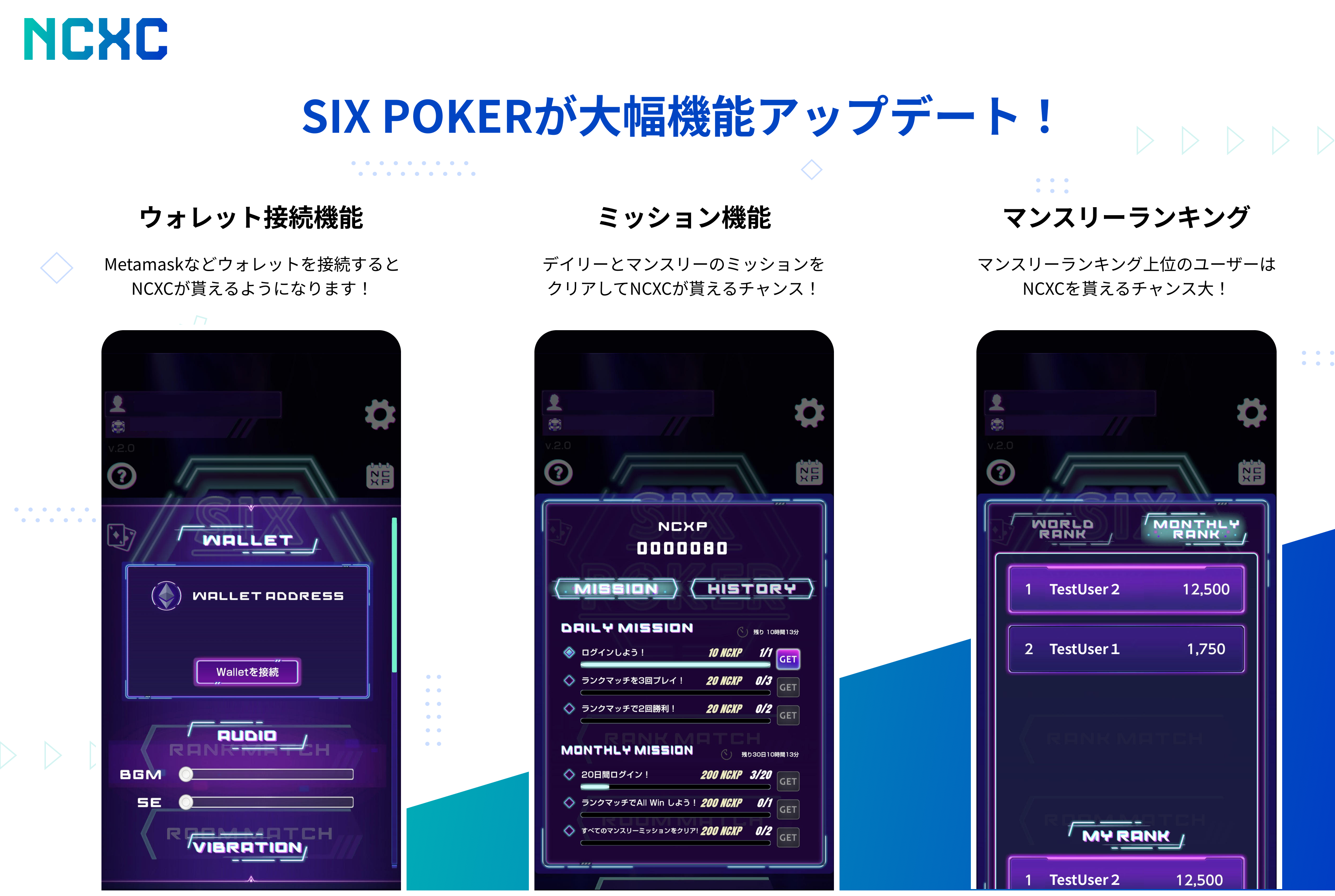 GameFiの第一弾として、スマホアプリゲーム「SIX POKER」の機能についてネクスポイント*1(以下、「NCXP」)を獲得できるよう大幅アップデートし、接続した外部ウォレットにてNCXCを貯めることが可能となりました。