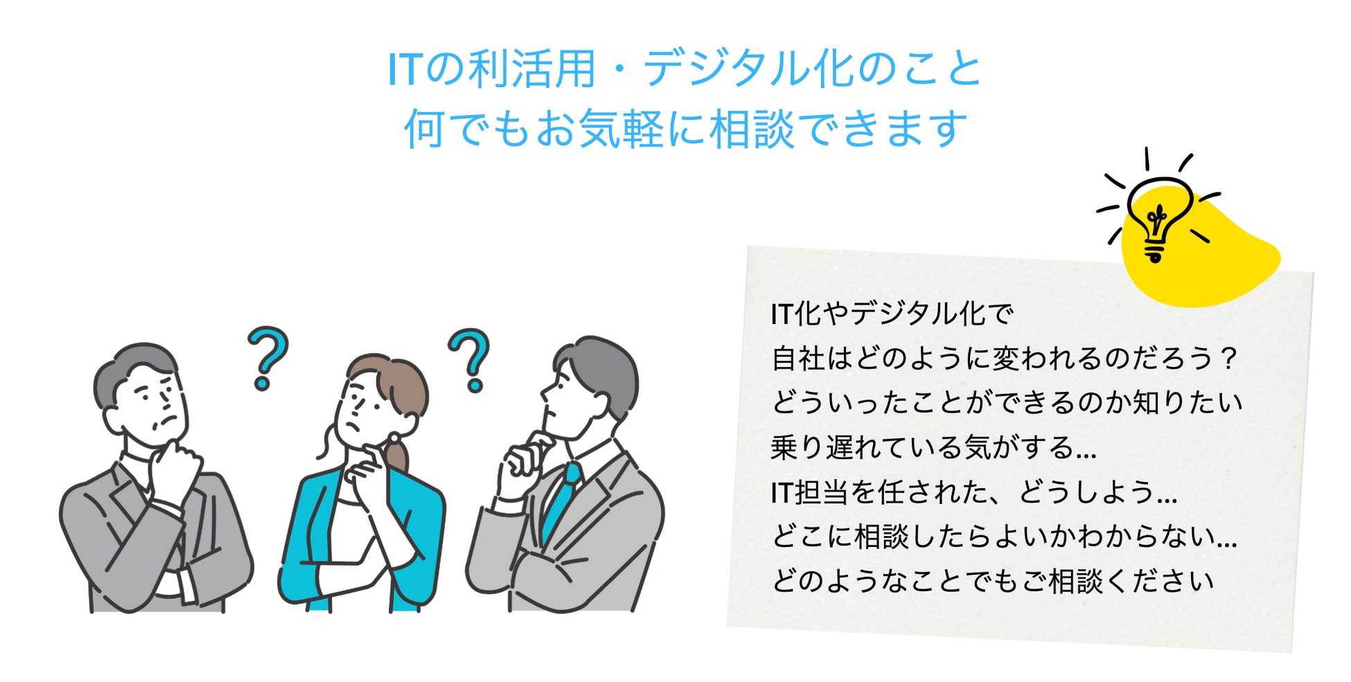 〜IT、デジタル化、DXの何からはじめればよいかわからない…といったお悩みから具体的な相談まで、経営者、IT担当、スタッフ担当者に寄り添います〜
