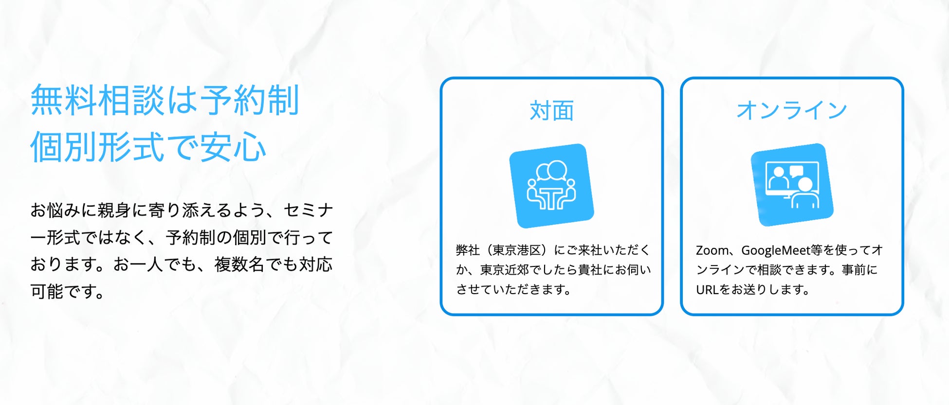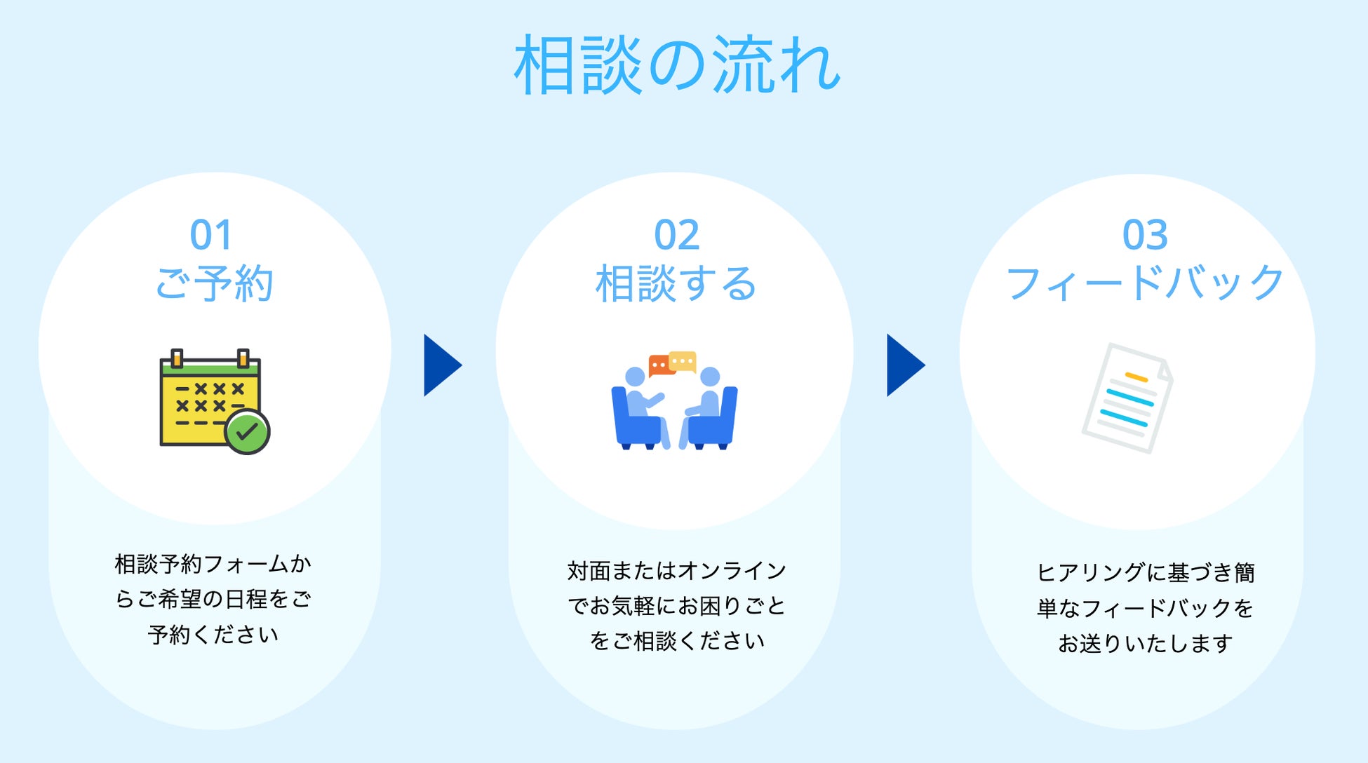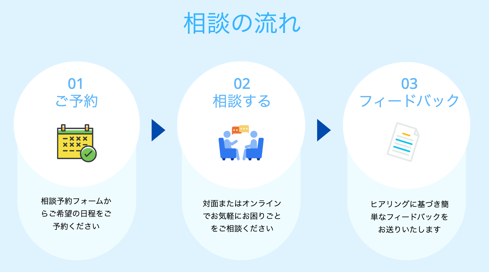 ITよろず相談は対面またはオンライン(ウェブ会議形式)で受付けています。予約制の個別相談形式で行っており相談は無料でご利用いただけます。相談はSEをはじめとした専門スタッフが対応し、相談内容に基づきフィードバックをいたします。