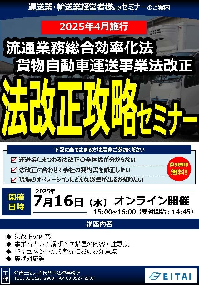 【オンラインセミナー】運送業者様向け「物流関連2法(流通業務総合効率化法 ・貨物自動車運送事業法)法改正攻略セミナー」を2025年7⽉16⽇に開催いたします。