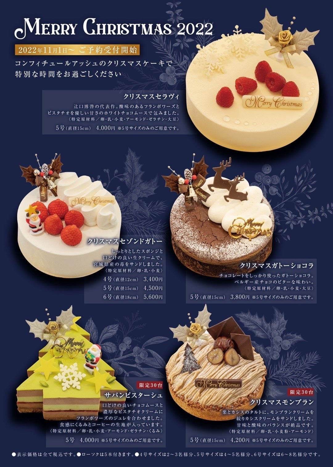 この度、アクアイグニス仙台内の「コンフィチュール アッシュ」にてクリスマスケーキを販売いたします。世界的パティシエ・ショコラティエである辻口博啓シェフ監修の特別なクリスマスケーキに仕上がっております。種類はテイストの異なった全5種類をご用意しておりますので、あなたにぴったりのケーキが見つかります。