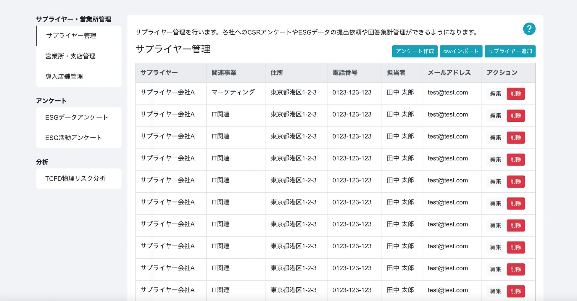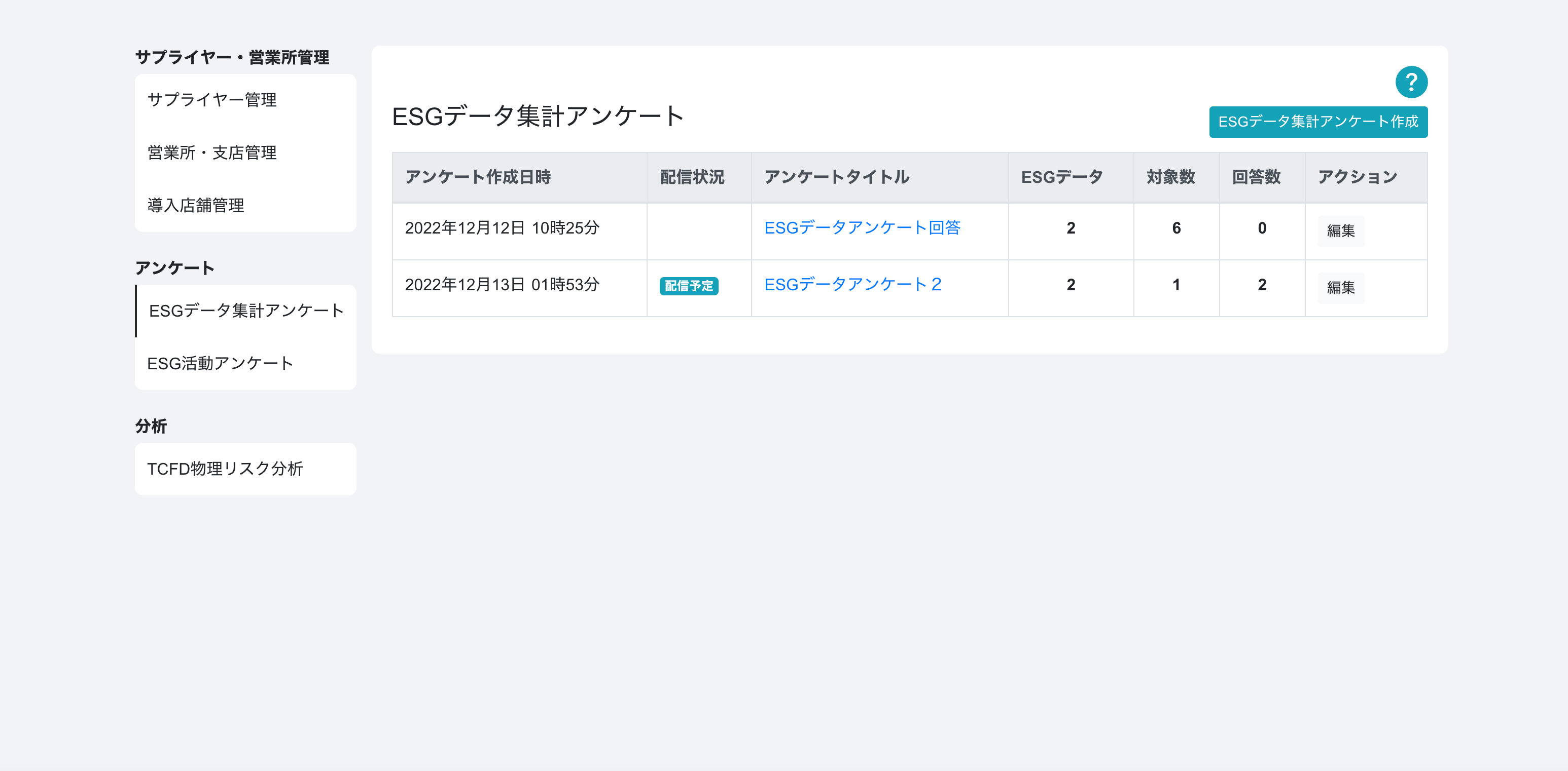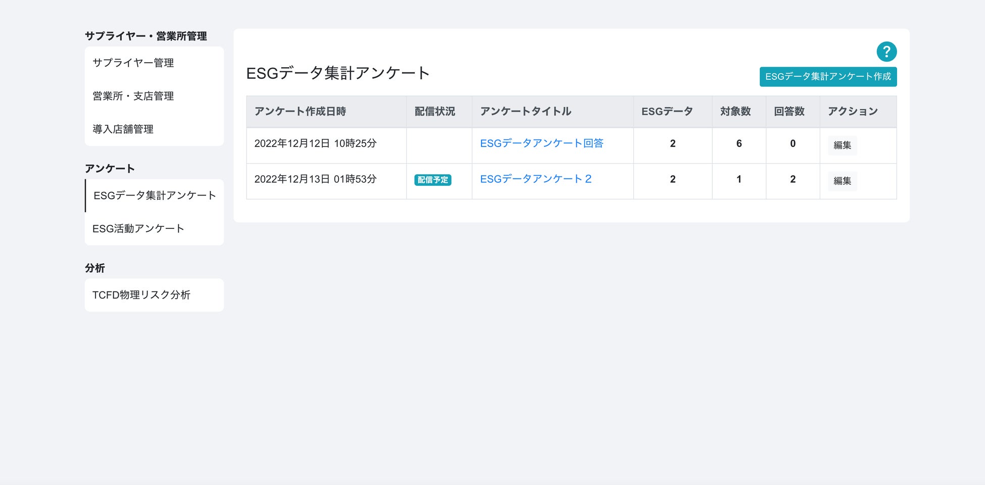 この度、ESG開示業務の中でも負荷の大きいサプライヤー管理を効率的に行える機能を新たに追加、リリースしました。サプライヤーや事業拠点、導入店舗管理機能、TCFD物理リスク分析機能、アンケート機能を新たに追加しました。
