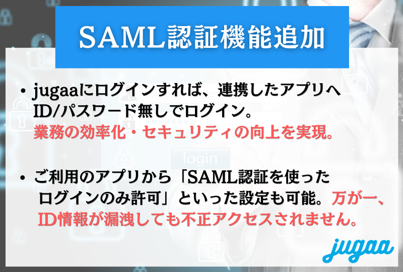 SAML認証機能の特徴として、ログイン時にID・パスワードが不要になることに加えて「このユーザーは営業部所属である」といった属性情報の登録をすることで、マーケティング部のユーザーだけSalesforceのメールマガジン配信機能を使えて、営業部は顧客管理機能だけ利用を許可するといった、アクセス制御が可能になる点があります。「jugaa」では、このアクセス制御機能についても実装を予定しており、お客様の更なる利便性の向上に努めて参ります。