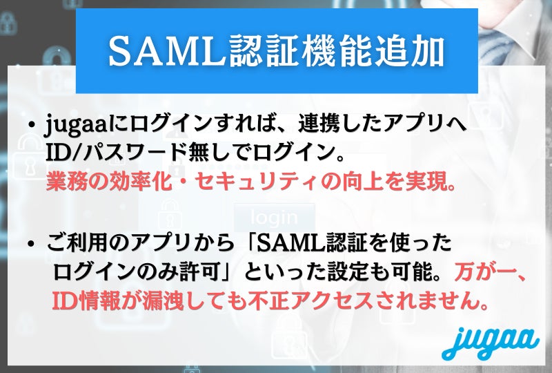 「jugaa」のようなシングルサインオンシステムは、パスワードを一括で管理し、登録済みパスワードの自動入力や登録アカウントを自動認証することで、パスワード漏洩や紛失リスク低減によるセキュリティの向上やパスワード管理業務の効率化といったメリットを提供しています。これまでの「jugaa」では、ユーザーが各アプリで発行したID・パスワードを「jugaa」に登録することで、2回目以降のログインは「jugaa」が登録済みのパスワード情報を代理入力することで自動ログインを実現する代理認証方式というシステムのみで対応していました。