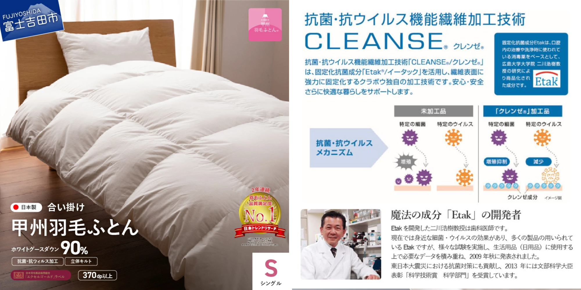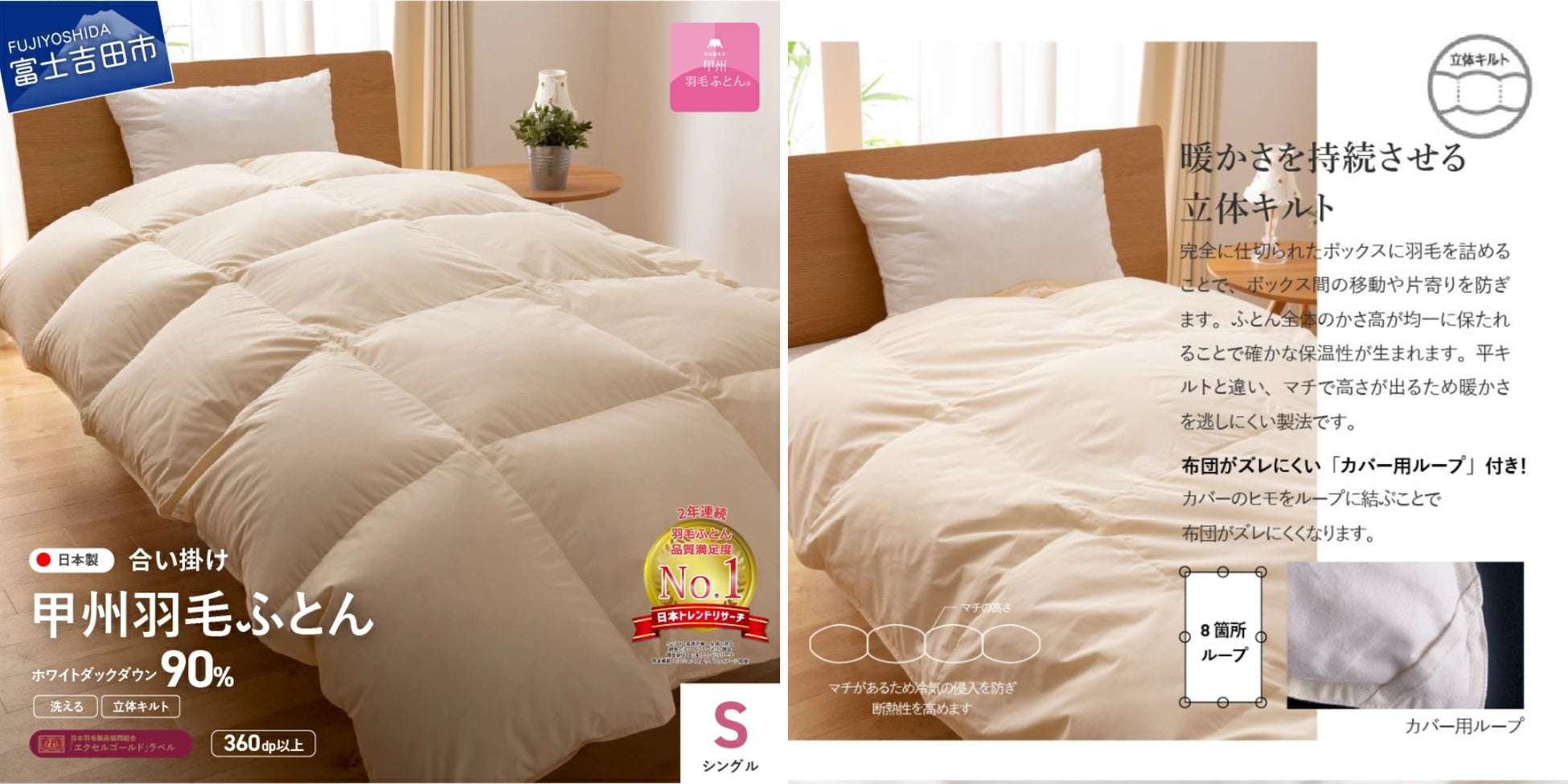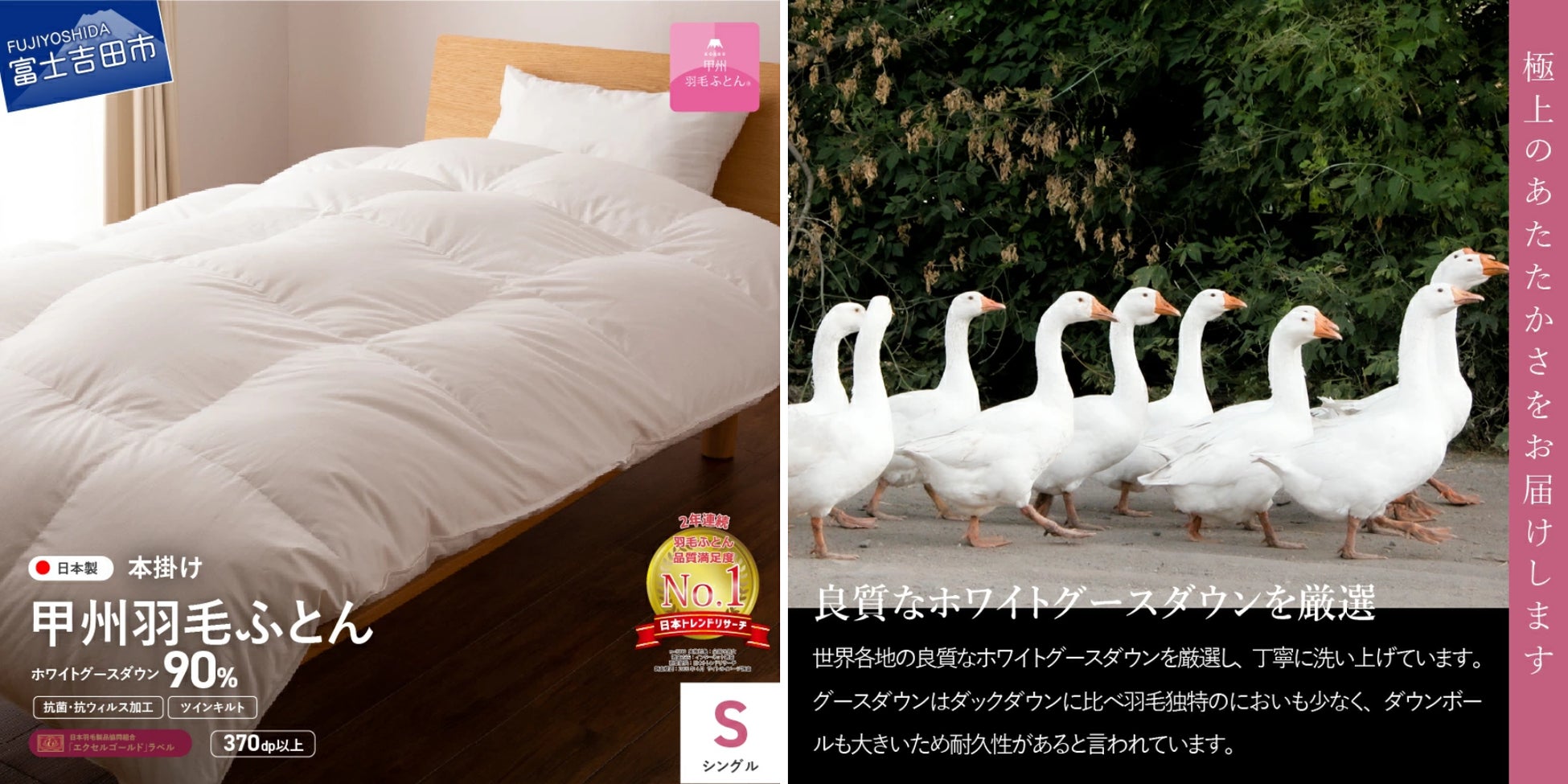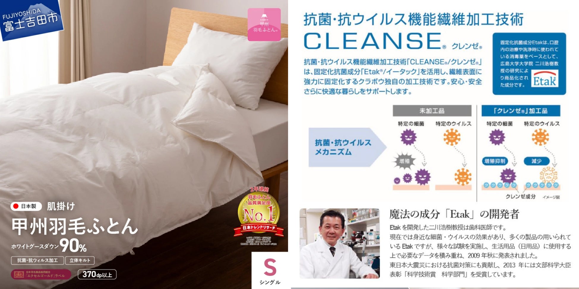▼寄付金額90,000円【甲州羽毛ふとん】抗菌・抗ウイルス加工羽毛合い掛けふとん(シングル)