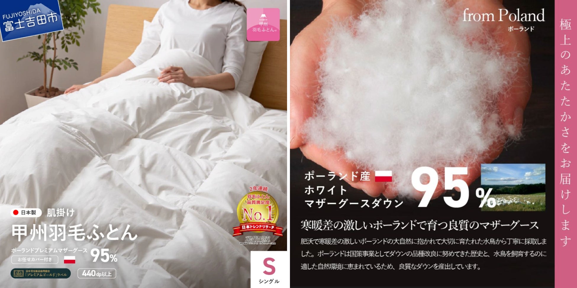 ▼寄付金額100,000円【甲州羽毛肌掛けふとん】ポーランドプレミアムマザーグースダウン95%超長綿 ホワイト (シングル) 羽毛布団 お任せカバー付き