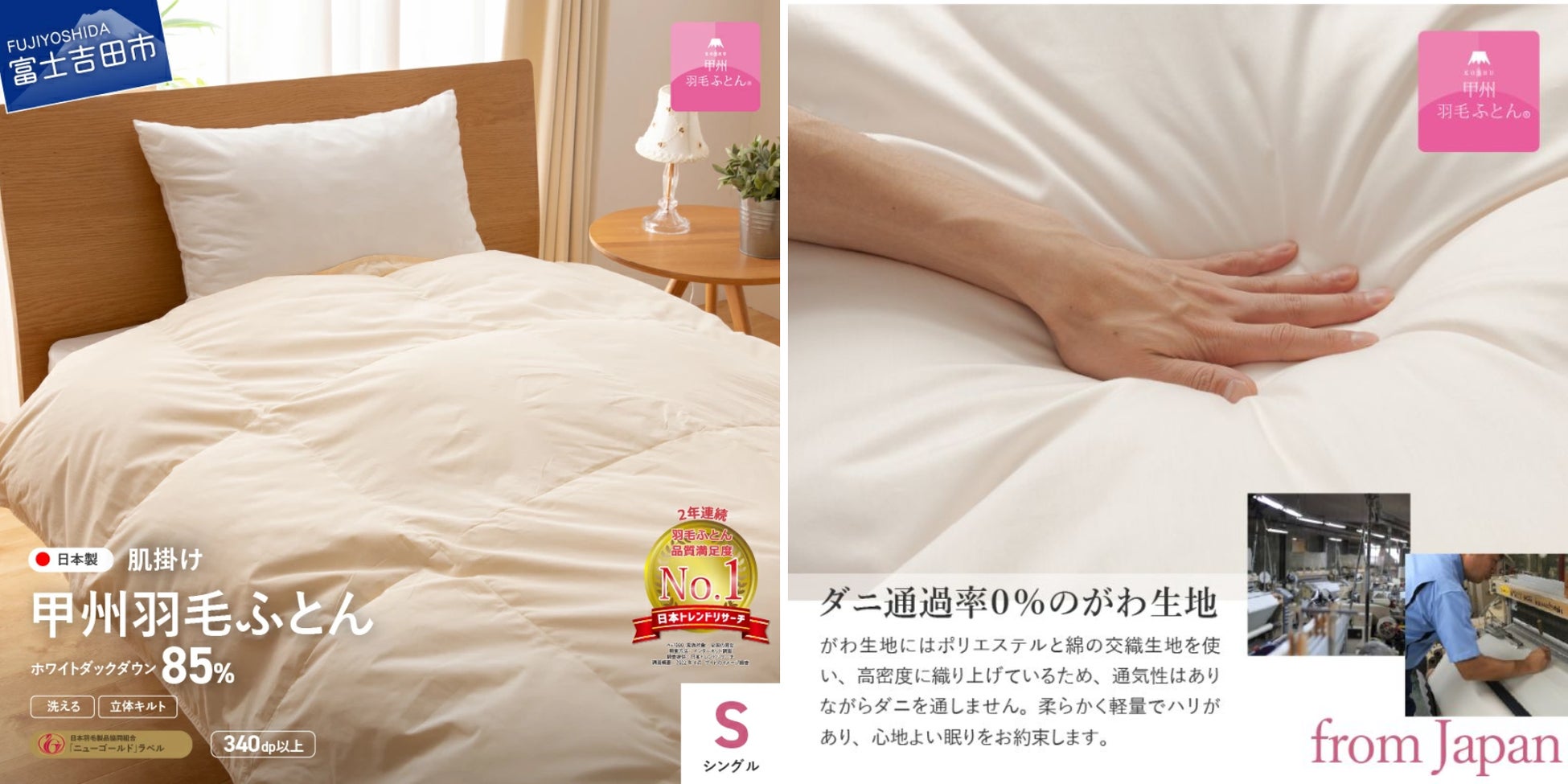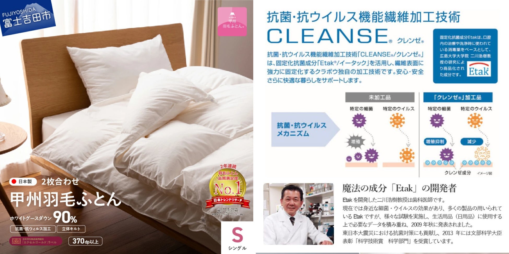 ▼寄付金額150,000円【甲州羽毛ふとん】抗菌・抗ウイルス加工羽毛2枚合わせふとん(シングル)