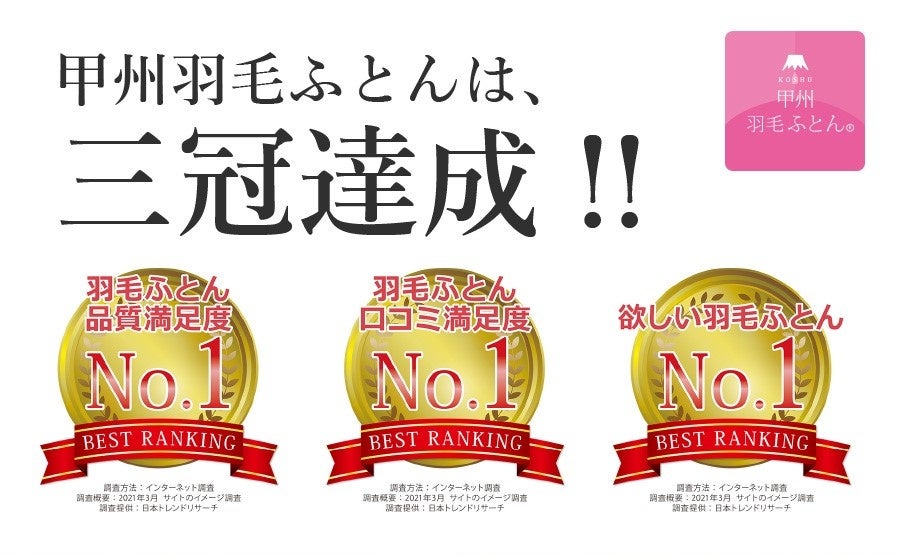 「羽毛ふとん品質満足度№1」「羽毛ふとん口コミ満足度№1」「欲しい羽毛ふとん№1」2年連続3冠達成。