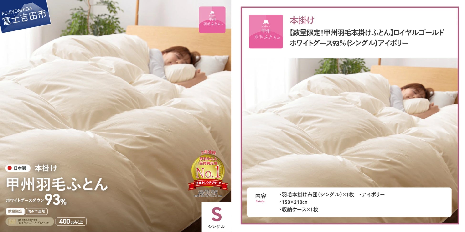 ▼寄付金額100,000円【数量限定!甲州羽毛本掛けふとん】ロイヤルゴールドホワイトグース93% (シングル) アイボリー