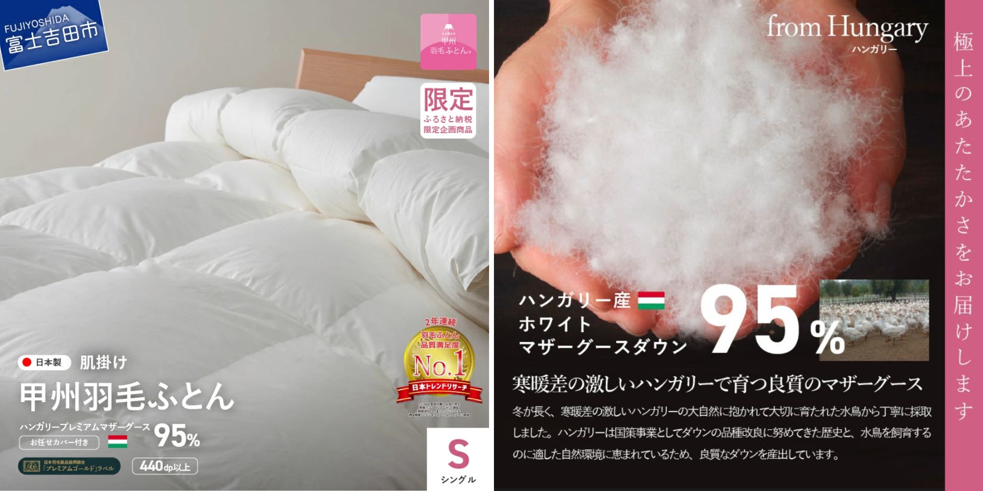 ▼寄付金額100,000円【甲州羽毛肌掛けふとん】ハンガリープレミアムマザーグースダウン95%超長綿 ホワイト (シングル) 羽毛布団 お任せカバー付き