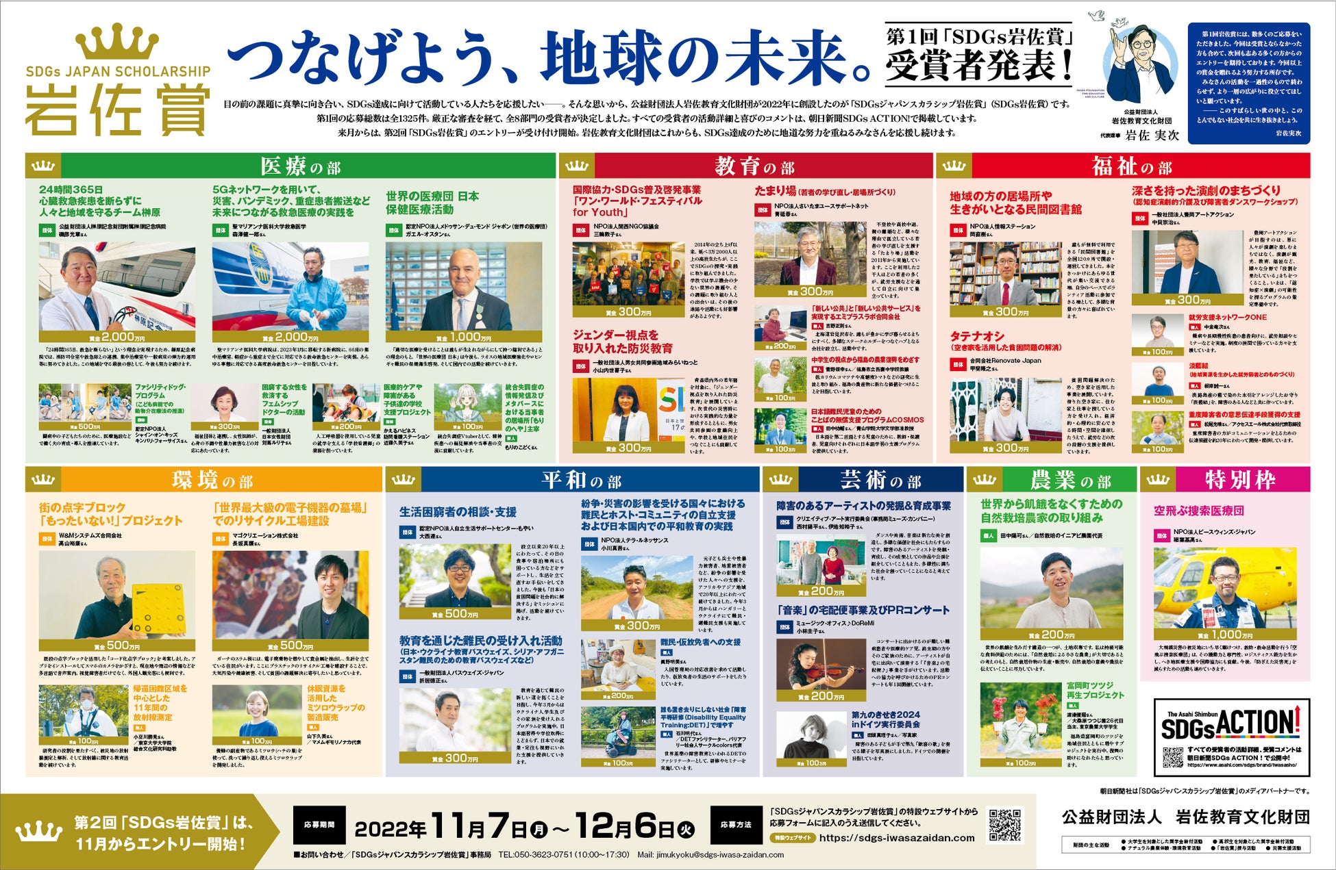 10月22日(土)朝日新聞朝刊<全国版>に第1回「SDGs岩佐賞」の受賞者をお知らせする全15段広告を掲載しました。