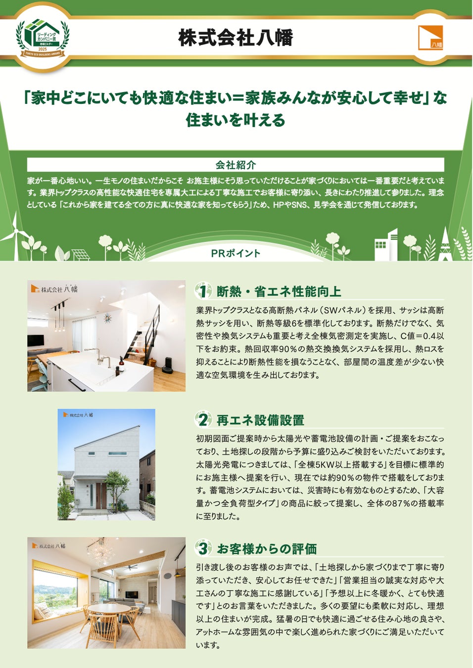八幡では、新築戸建注文住宅において「2030年度に標準化されると言われているZEH水準を大幅に超える住宅性能を提供する」を掲げており、お客様の住宅デザイン、ライフデザイン、予算を含むコストの要望を叶えながら、高性能住宅となる「断熱等級6」「一次エネルギー消費量等級6を遥かに超える40%削減」「C値0.4以下、且つ気密測定による性能報告の実施」を実現しています。これらを必須化し外皮等の強化を図っています。高性能住宅に住むことは健康の改善と密接に関係しており、住む人の将来までを考えた住宅の提供をこれからも行って参ります。
