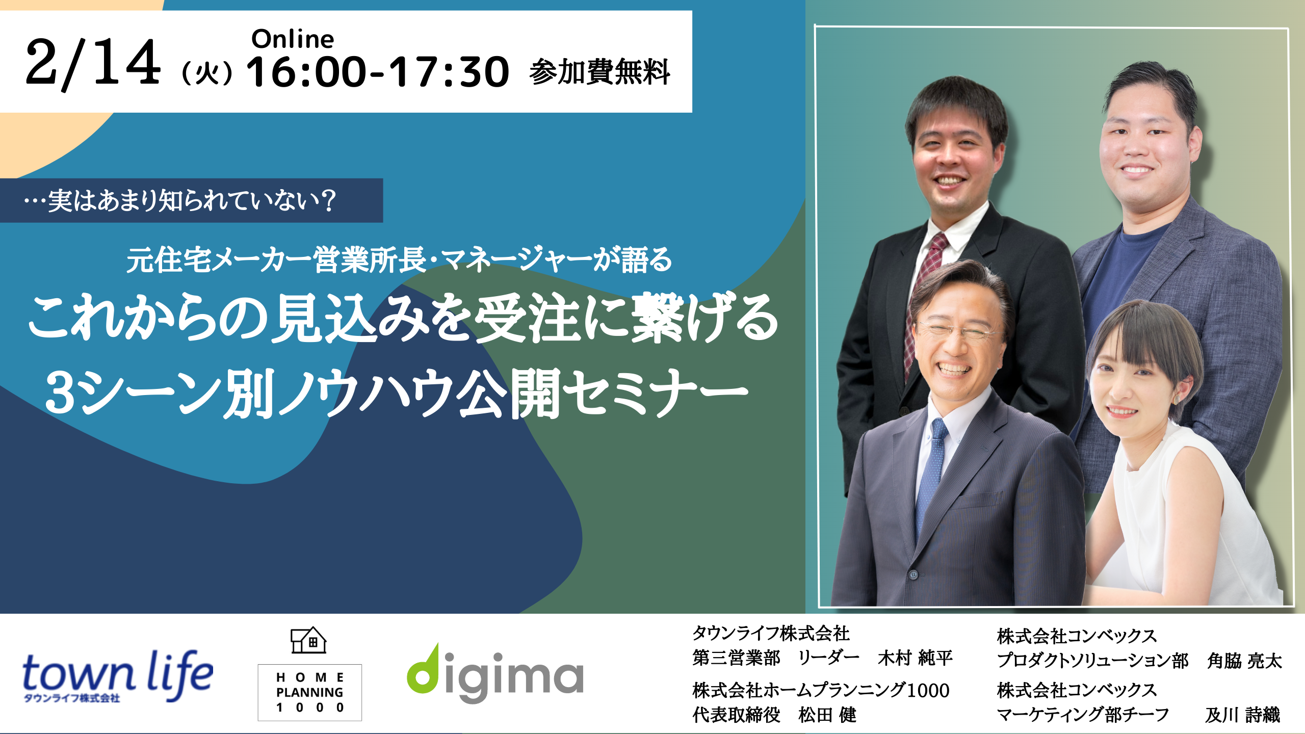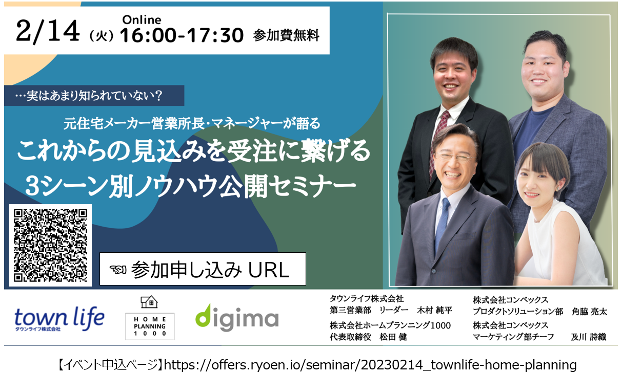 ホームプランニング1000株式会社(本社:東京都港区 代表取締役:松田健)は、タウンライフ株式会社(本社:東京都新宿区 代表取締役:笹沢竜市)と株式会社コンベックス(本社:東京都渋谷区 代表取締役:美里泰正)と「住宅会社・不動産会社の受注増加」を目的として、2023年2月14日(火)に3社共催セミナーを開催いたします。オンライン開催で参加費無料です。