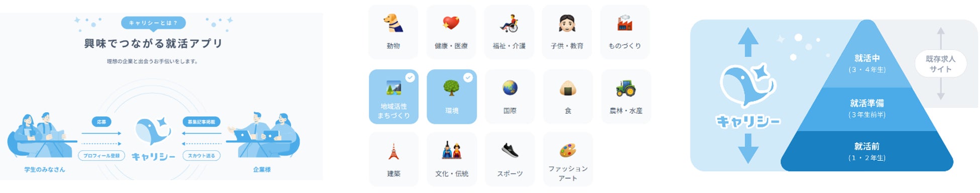 キャリシーは、学生の声から誕生した「興味と共感」を軸に、学生と企業が出会うことができる新しい形の新卒採用プラットフォームです。