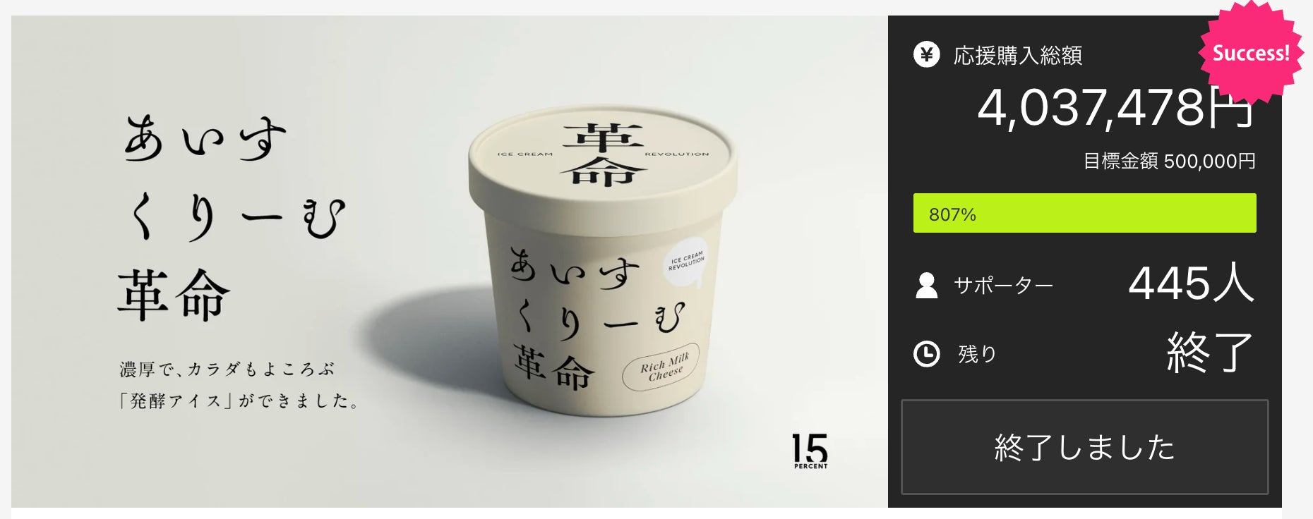 米麹の持つ旨味·甘味成分を活用し、卵不使用、砂糖96%カット(当社比)で製造した味覚重視の発酵アイスクリームです。2024年6月1日(土)よりmakuakeにて先行販売を開始し、支援開始24時間で100万円突破、Makuake内のアイスクリームカテゴリーにて支援購入額歴代2位(4,037,478円)で目標達成した。(募集期間:29日間)