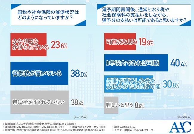 先ほどの質問で『猶予期間を終え支払いをしている途中である』『猶予期間が終わったが支払いきれず滞納している』と回答した方に、「国税や社会保険の催促状況はどのようになっていますか?」と質問したところ、『かなり圧をかけられている(23.6%)』『督促状が届いている(38.0%)』『特に催促はされていない(38.4%)』 という回答結果になりました。