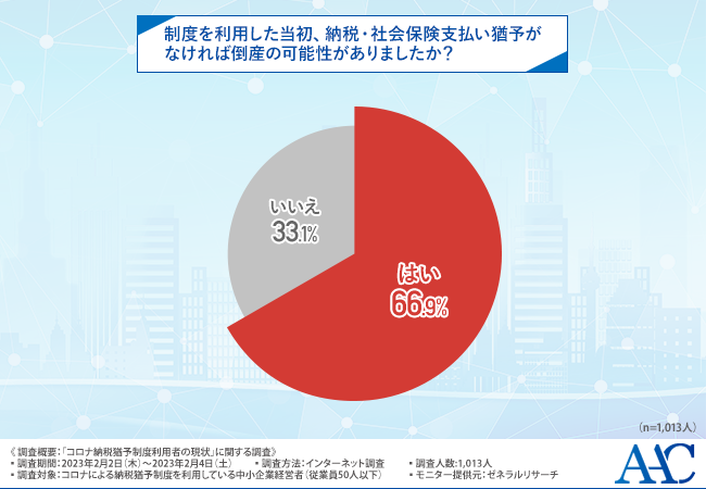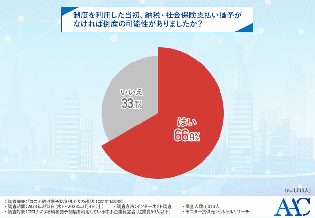 「制度を利用した当初、納税・社会保険支払い猶予がなければ倒産の可能性がありましたか?」と質問したところ、6割以上の方が『はい(66.9%)』 と回答しました。