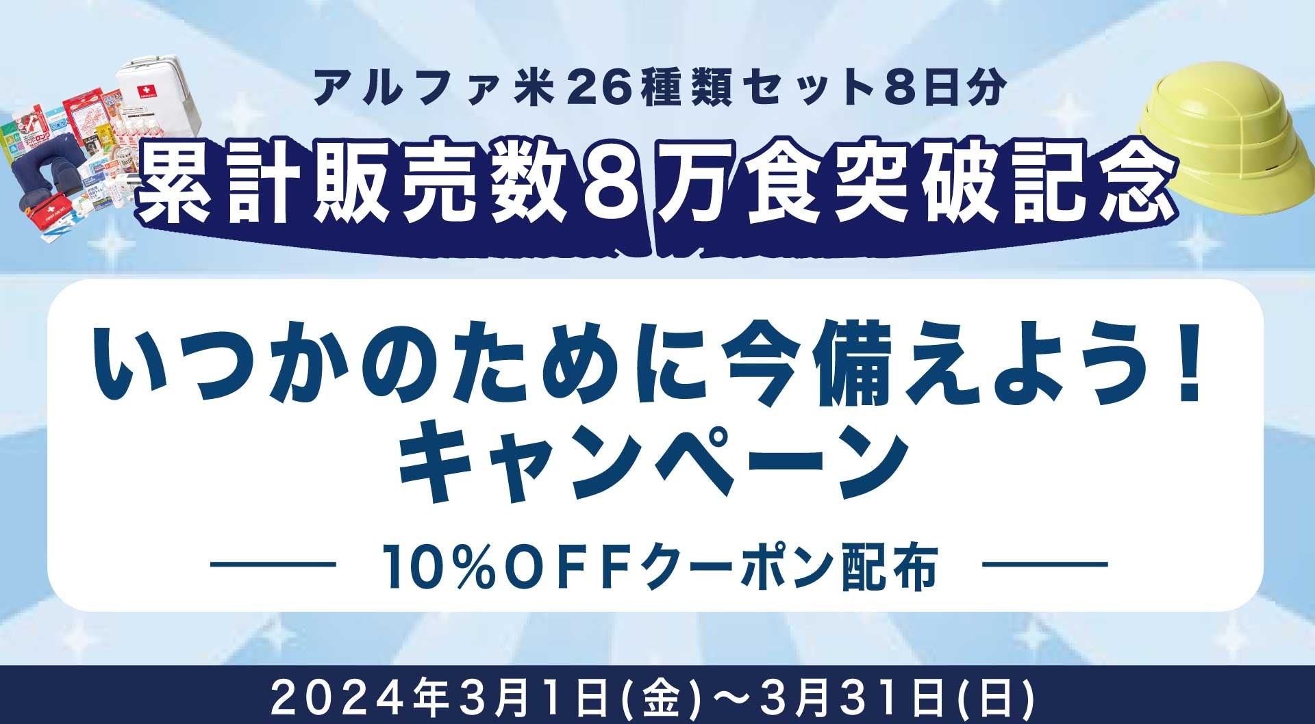 防災防犯ダイレクトは「アルファ米26種類セット8日分」の累計販売数が8万食(3,200セット)を突破したことを記念し、2024年3月1日(金)〜3月31日(日)の期間限定で、公式オンラインショップ「防災プロの地震対策SHOP」にて当商品が10%OFFになる『いつかのために今備えよう!キャンペーン』を開催いたします。