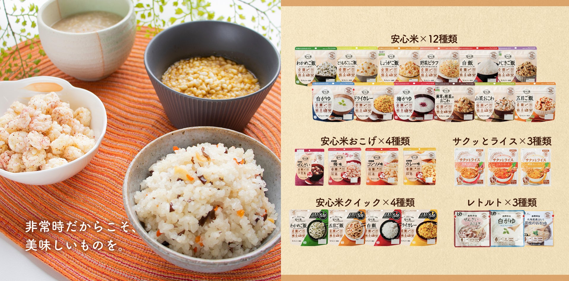 セット内容 | ■安心米(12種類) 白飯/わかめご飯/五目ご飯/とうもろこしご飯/野菜ピラフ/ ドライカレー/山菜おこわ/舞茸と根菜のおこわ(玄米入り)/ ひじきご飯(玄米入り)/しょうがご飯(玄米入り)/白がゆ/梅がゆ ■安心米おこげ(4種類) コンソメ味/カレー味/梅味/ぜんざい ■サクッとライス(4種類) ミネストローネ/野菜カレースープ/和風五目スープ ■レトルト(3種類) 白がゆ/北海道産ほたて貝柱のおかゆ/ぜんざいおはぎ ■安心米クイック(4種類) 白飯/五目ご飯/わかめご飯/ドライカレー |