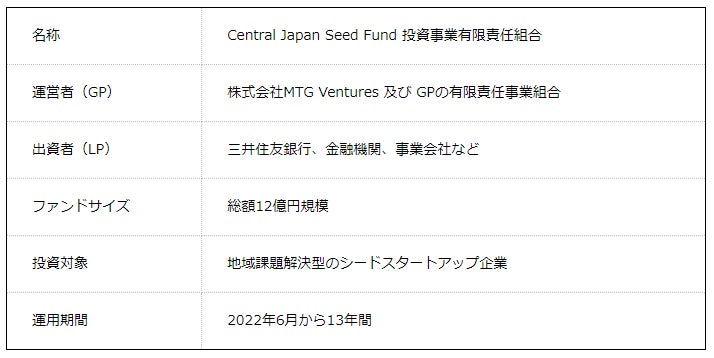 MTGグループのコーポレートベンチャーキャピタルである株式会社MTG Ventures(本社: 愛知県名古屋市、代表取締役社長: 藤田 豪)は、当社を無限責任組合員とし、地域の課題解決に取組むシードスタートアップを対象とする「Central Japan Seed Fund(以下、CJS)」を組成し、投資活動を開始したことをお知らせいたします。