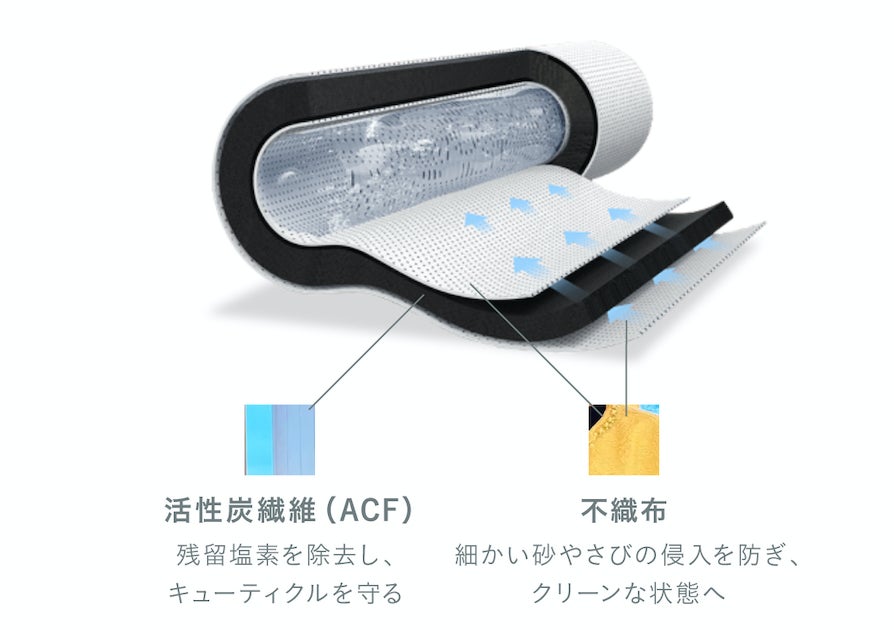 ✔️ 天然素材の三層構造活性炭フィルターで塩素除去「キューティクルを守る」