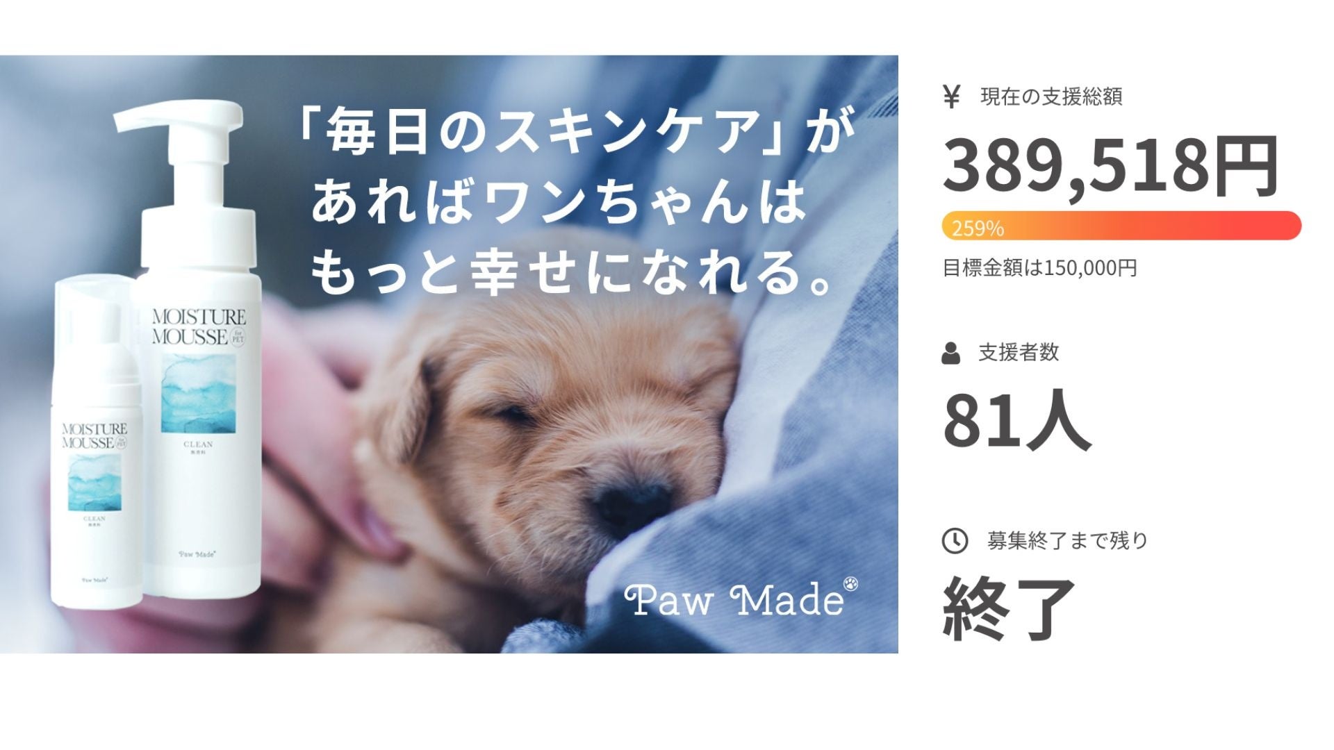 日本中の犬から皮膚トラブルをなくしたい!という思いから、ペット用の泡の保湿剤「モイスチャームース」の初回生産分の事前購入をクラウドファンディングサイト「CAMPFIRE」にて約一ヶ月間募集いたしました。