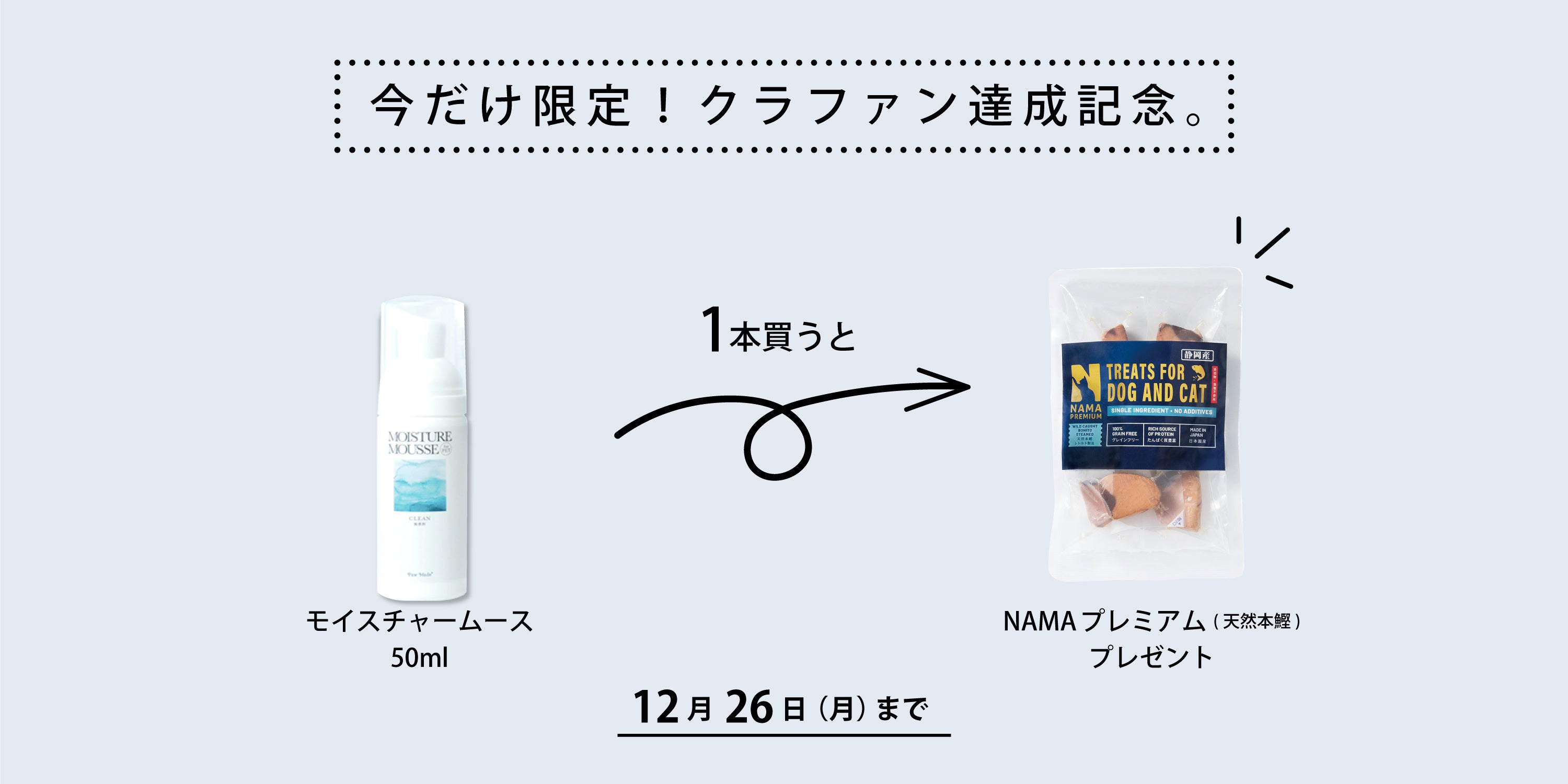 期間中、モイスチャームース50mlを購入頂いた方にもれなく、NAMAプレミアム天然本鰹を1袋プレゼントいたします。