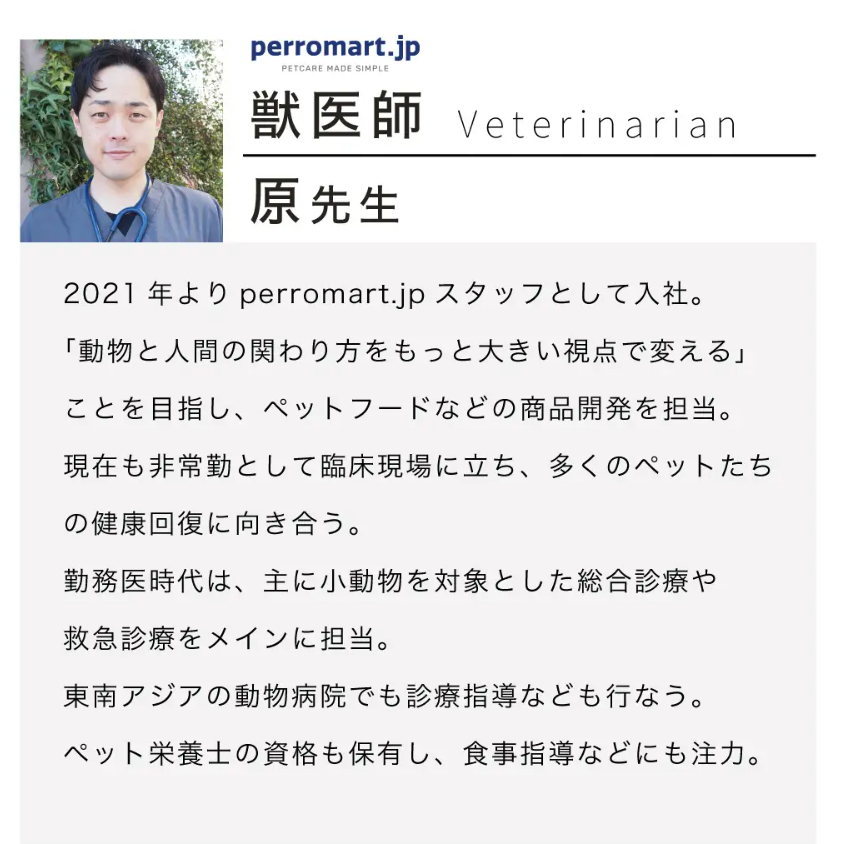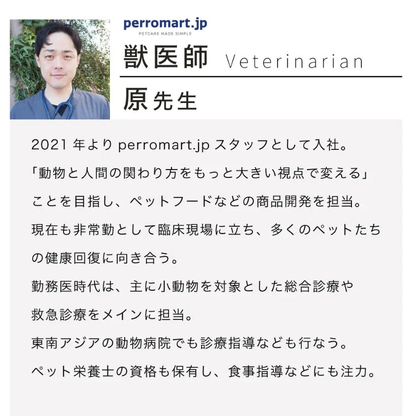 この商品はperromart.jpのスタッフである獣医師が普段、獣医師として病院で診察する中で出会う皮膚病のあまりの多さ、ペアレントさんがそれに対して家でできる対策の少なさに対する問題意識、そして共同開発をすることになった会社さんとの偶然の出会いが重なって生まれた商品です。