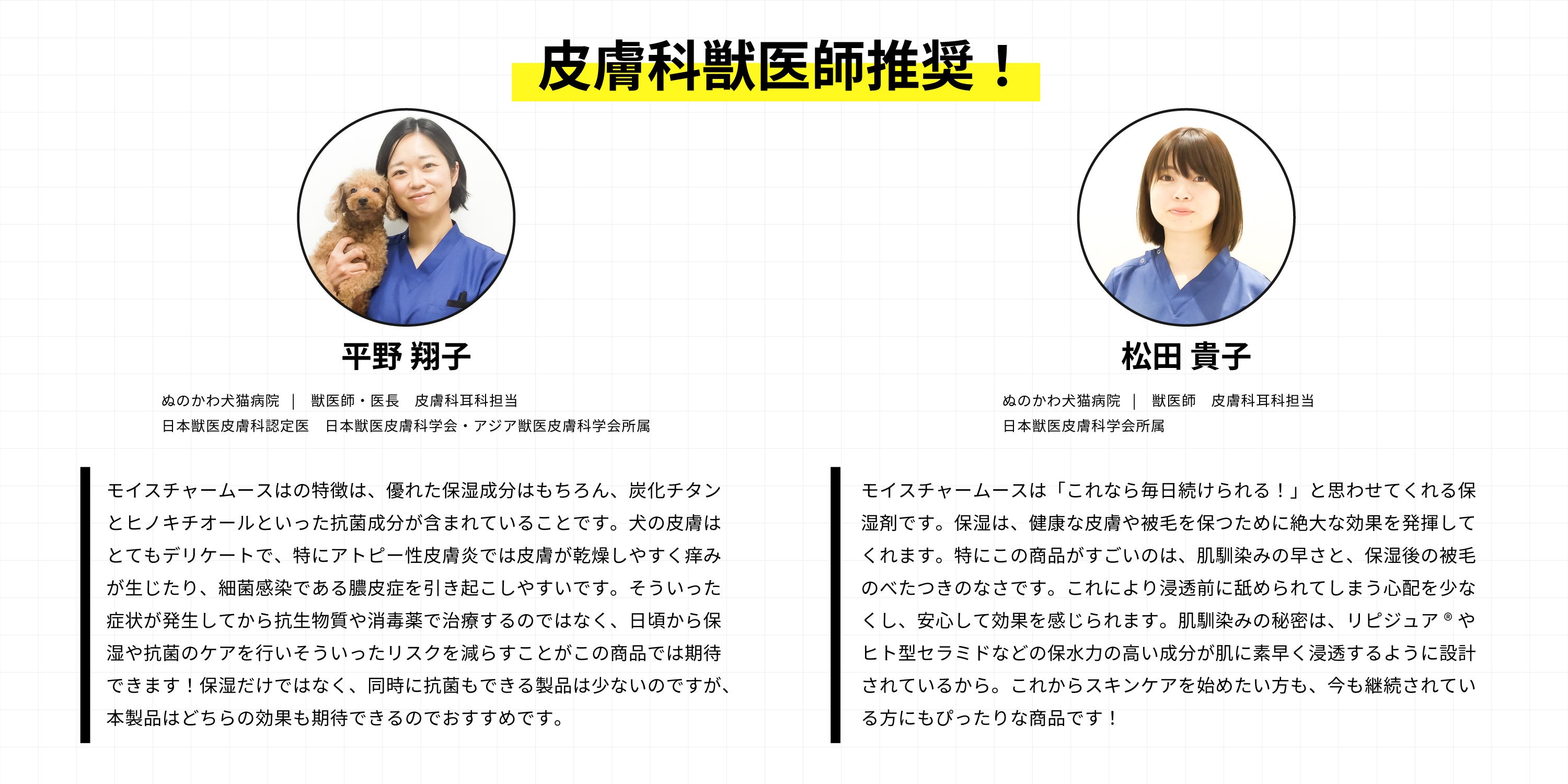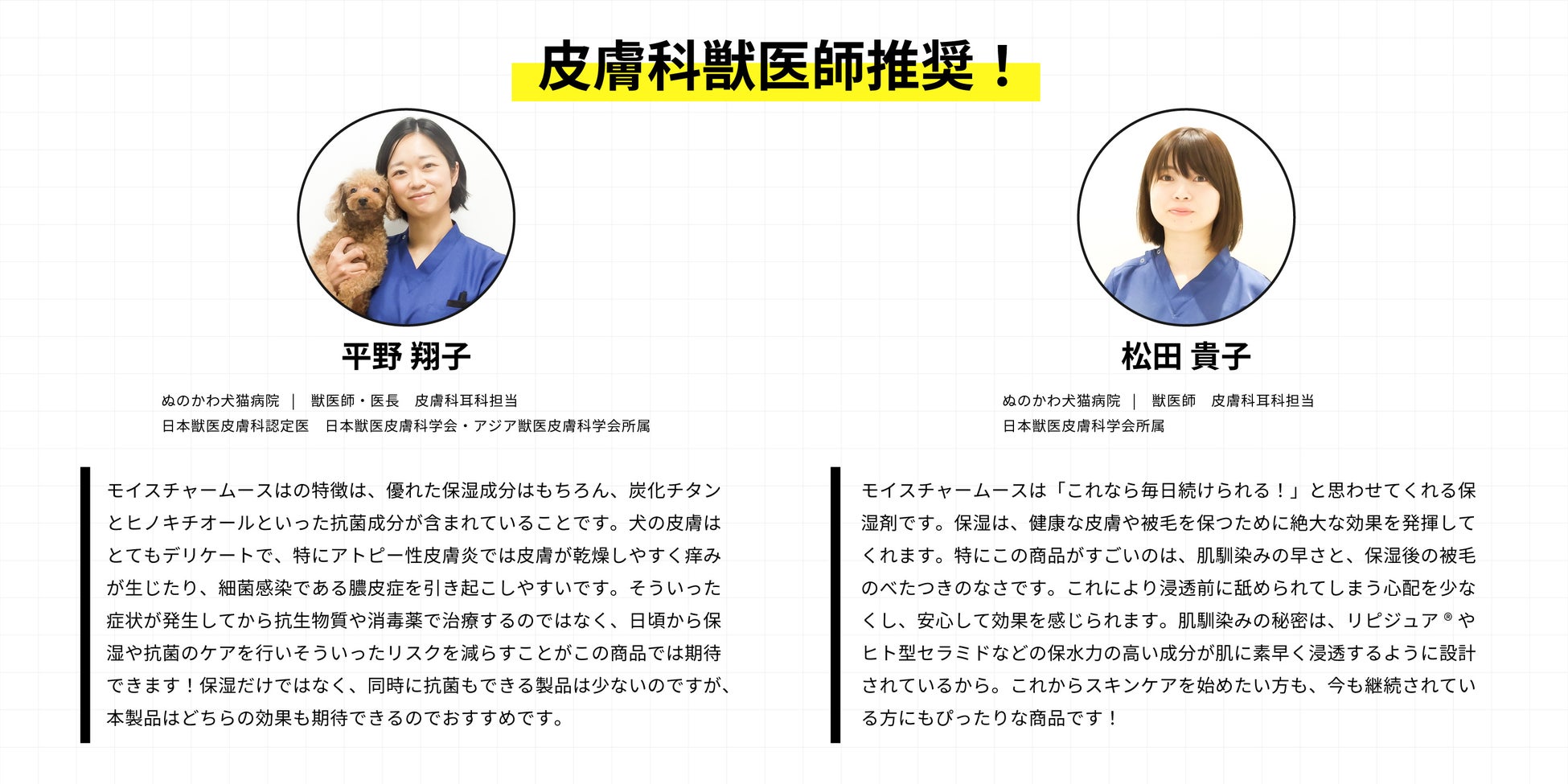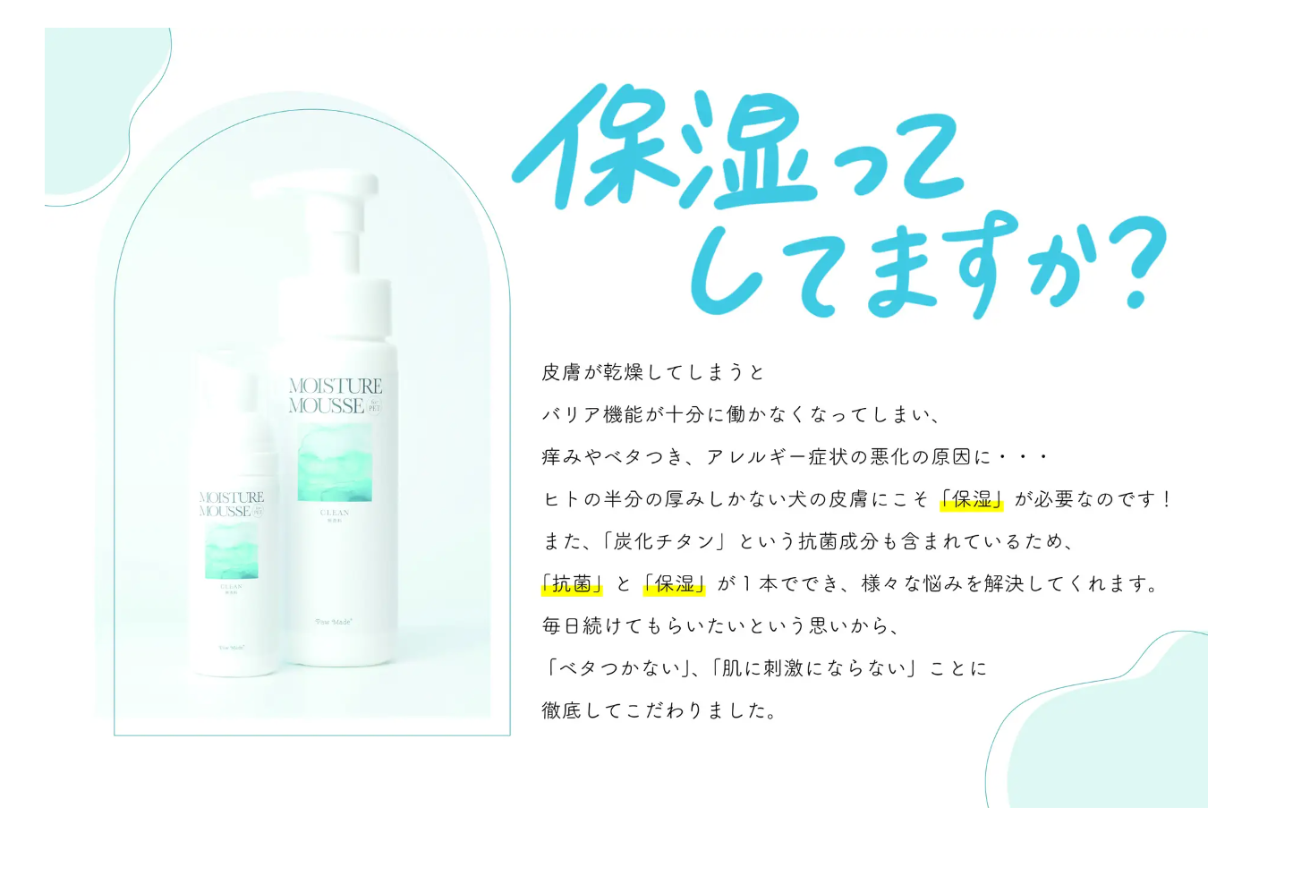 この問題を解決したいと考えた現役の獣医師が、人向けの化粧品会社と偶然出会ったことで誕生したペット用泡の保湿剤モイスチャームース。