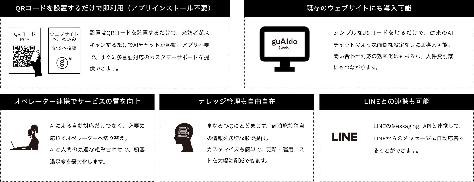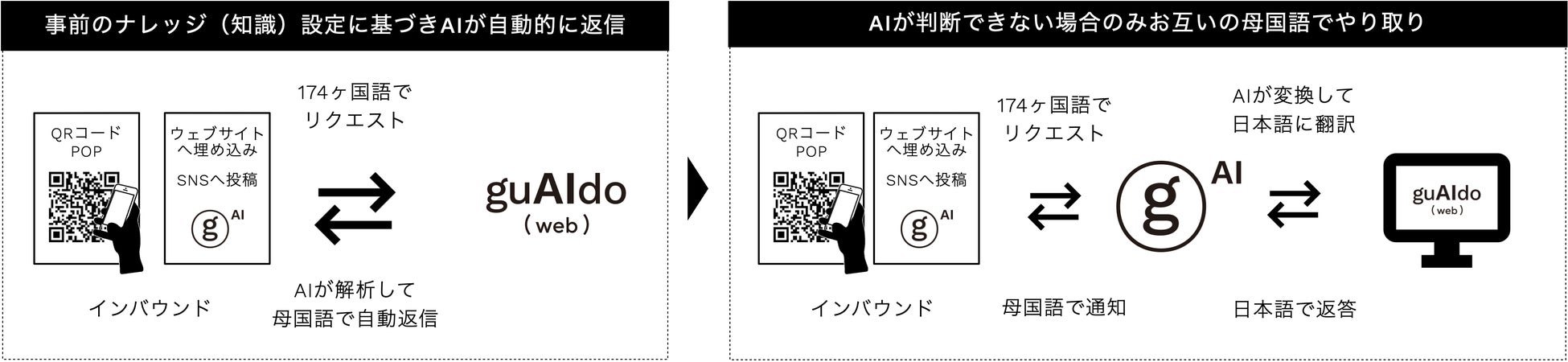 日本への急激なインバンドの上昇に伴い、様々な業種で多言語によるコミュニケーションが必要不可欠となりました。2025年3月の訪日外客数は3,497,600人で前年同月比では13.5%増とさらに増加する一方、課題の大半は言語の壁です。この課題を解決するためのツールとして“guAIdo(ガイド)”は生まれました。“guAIdo”を通してお互いの言語で会話できる世界を実現すると同時に、業務軽減を目指したサービスをご提供いたします。
