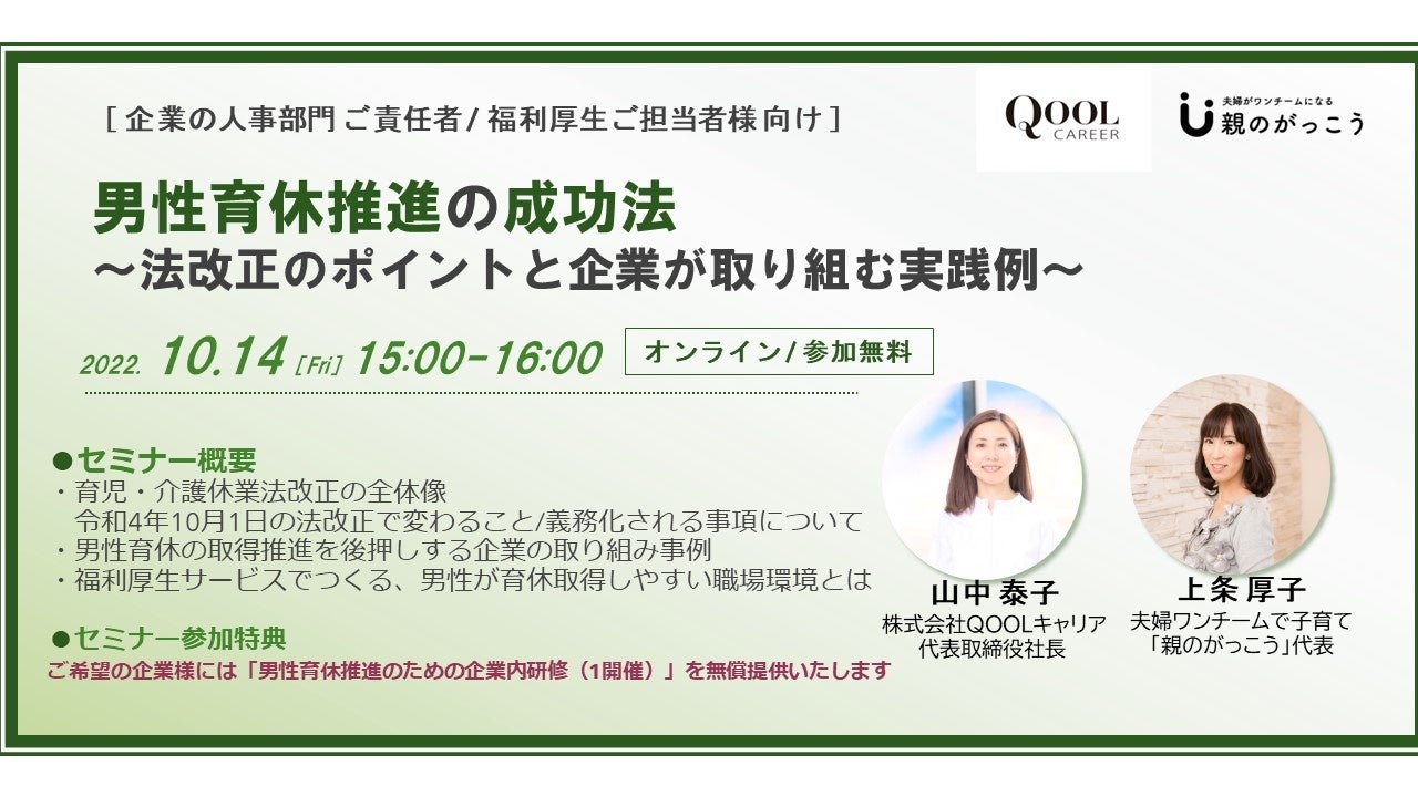 ライフステージ特化型 福利厚生サービス「 TUMUGU(つむぐ)」を提供する株式会社QOOLキャリア( 本社:東京都港区北青山 2-12-28 青山ビル 5 階 代表:山中泰子 )は、育児・介護法改正に伴う産後パパ育休( 出生時育児休業)の創設に際し、企業の人事担当者向けに 無料オンラインセミナー「 男性育休推進の成功方~法改正のポイントと企業が取り組む実践例~」をママライフバランス株式会社との共催にて 10 月 14 日 ( 金 ) 15 時より開催いたします。