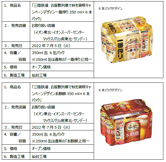 キリンビール株式会社流通営業本部(本部長 井上一弘)は、イオン東北株式会社(代表取締役社長 辻󠄀雅信)を含む、東北イオングループ4社(イオンスーパーセンター株式会社、マックスバリュ南東北株式会社、株式会社サンデー)と、三陸鉄道株式会社(代表取締役社長 石川義晃)の3社共同にて「三陸鉄道 お座敷列車で秋を満喫キャンペーン」を7月4日(月)より実施いたします。あわせて、「キリン 一番搾り」「本麒麟」ブランドから「三陸鉄道 お座敷列車で秋を満喫キャンペーンデザイン一番搾り・本麒麟350ml缶×6本パック」を7月5日(火)より東北イオングループ4社で、数量限定で発売します。