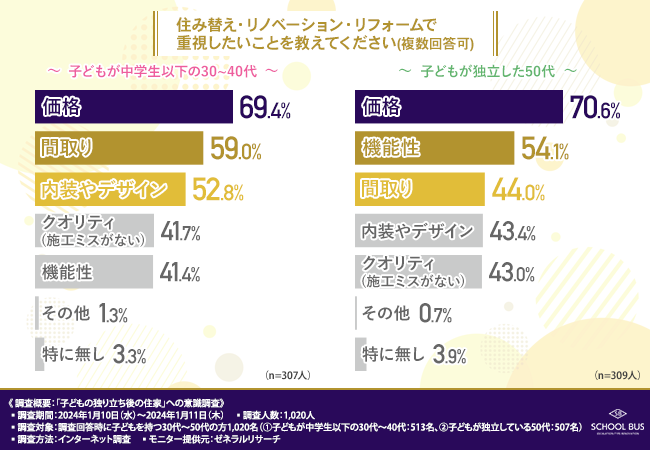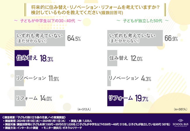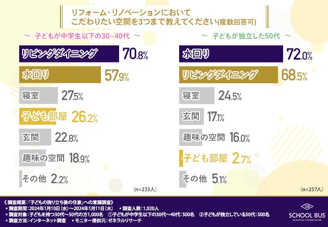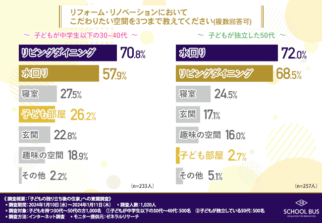 そこで今回、リノベーションで快適な暮らしをデザインするスクールバス空間設計株式会社(https://www.school-bus.jp/osaka/)は子どもを持つ30代~50代の方1,000名(①子どもが中学生以下の30代~40代:500名、②子どもが独立している50代:500名)を対象に「子どもの独り立ち後の住家」への意識調査を実施しました。