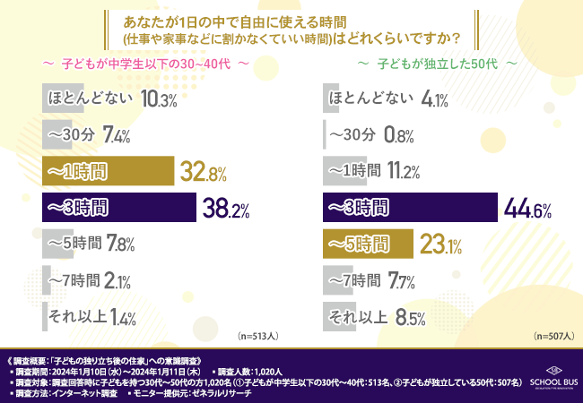 今回の調査から、中学生以下の子どもがいる家庭と、子どもが独立した家庭で自由に使える時間に差があることが示されました。