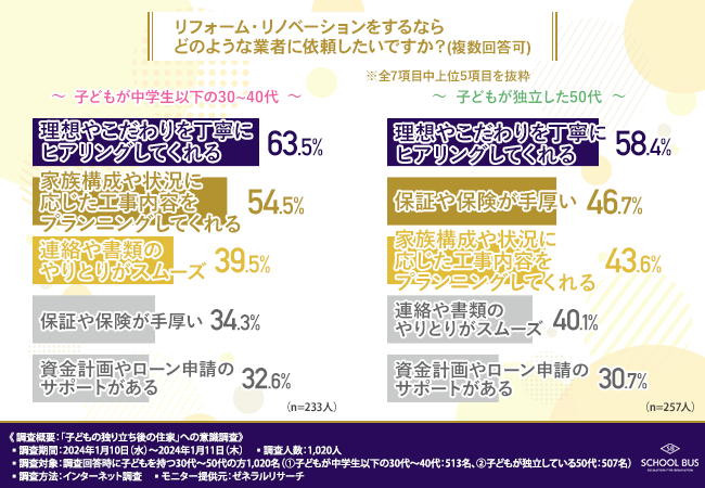 「リフォーム・リノベーションをするならどのような業者に依頼したいですか?(複数回答可)」と質問したところ、子どもが中学生以下の30代〜40代の方と子どもが独立した50代の方の回答結果は上位順に以下のとおりになりました。