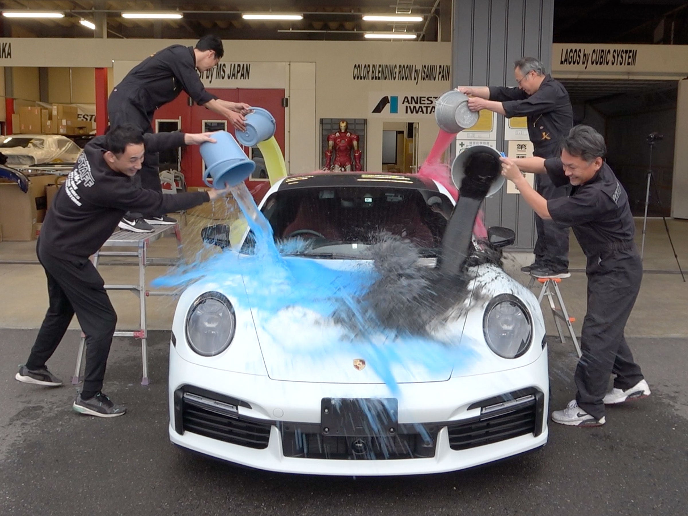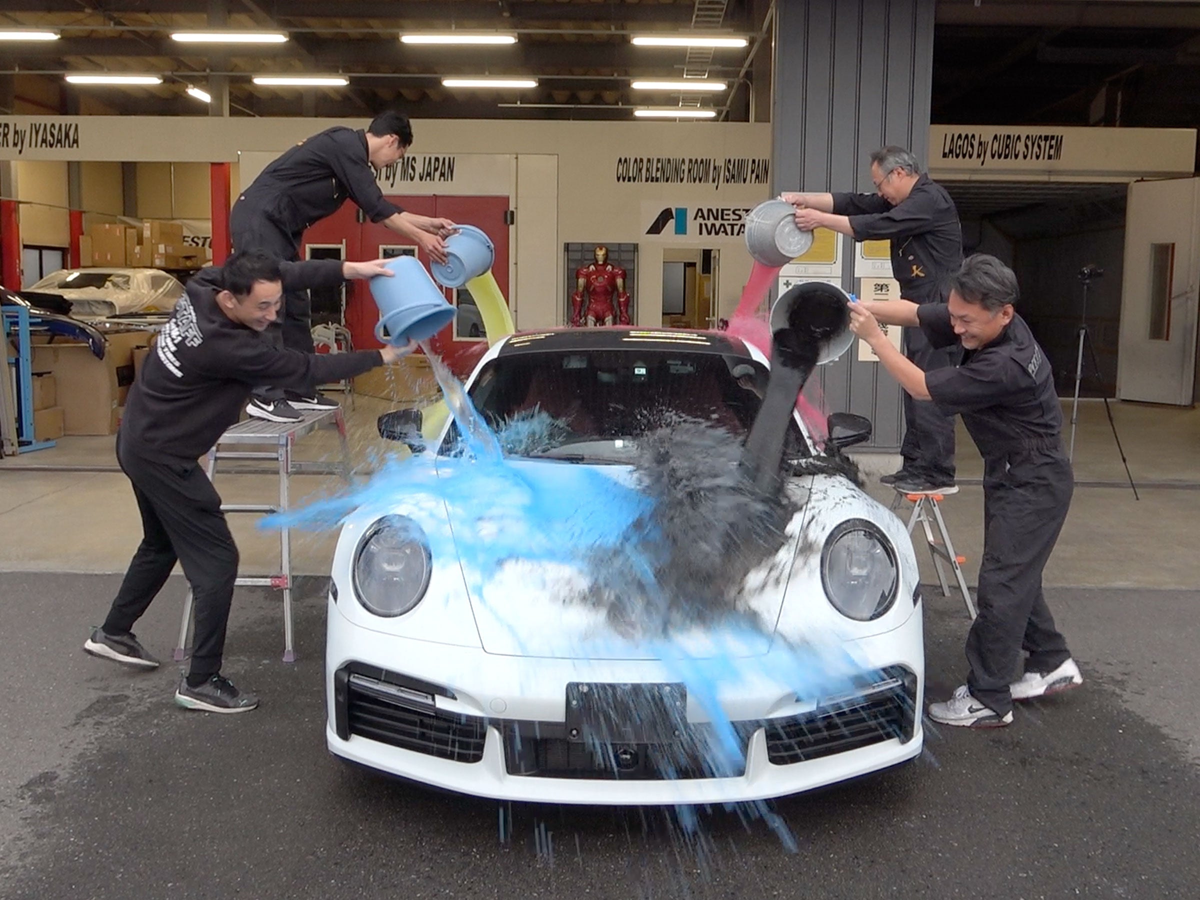 施工後のボディに色のついた水を掛けて超撥水効果を確認、バケツで掛けられた水を見事に弾き「世界一濡れないポルシェ」が誕生しました。