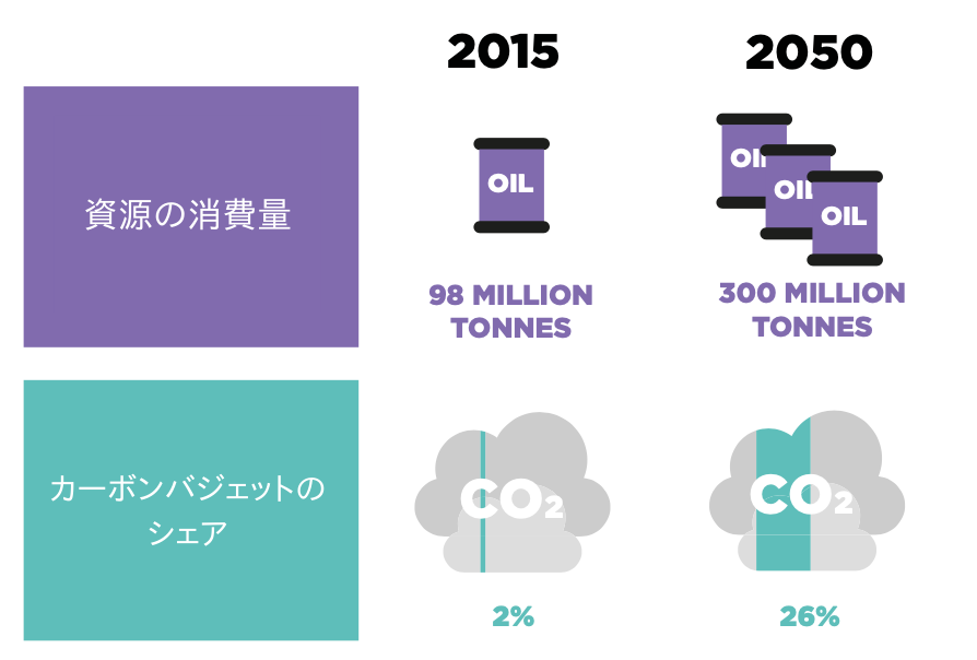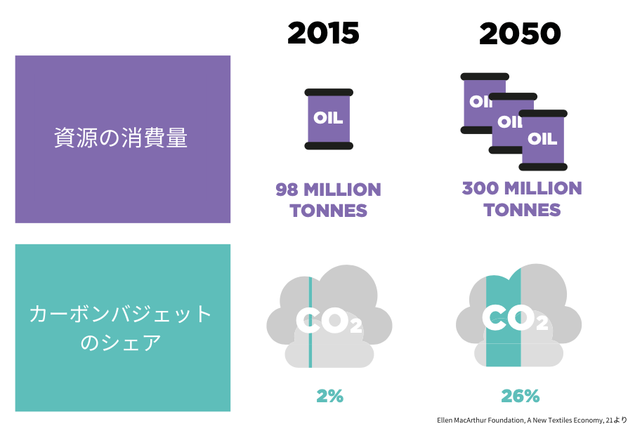 ファッション産業は、2番目に地球環境を破壊している産業です。現在でも、全体の年間で約8%にあたる21億トンものCO2を排出していますが、衣類の生産量は年々増えています。このままだと、2050年までに衣類の消費が現在の3倍に増え、環境への負荷も重くなります*3。