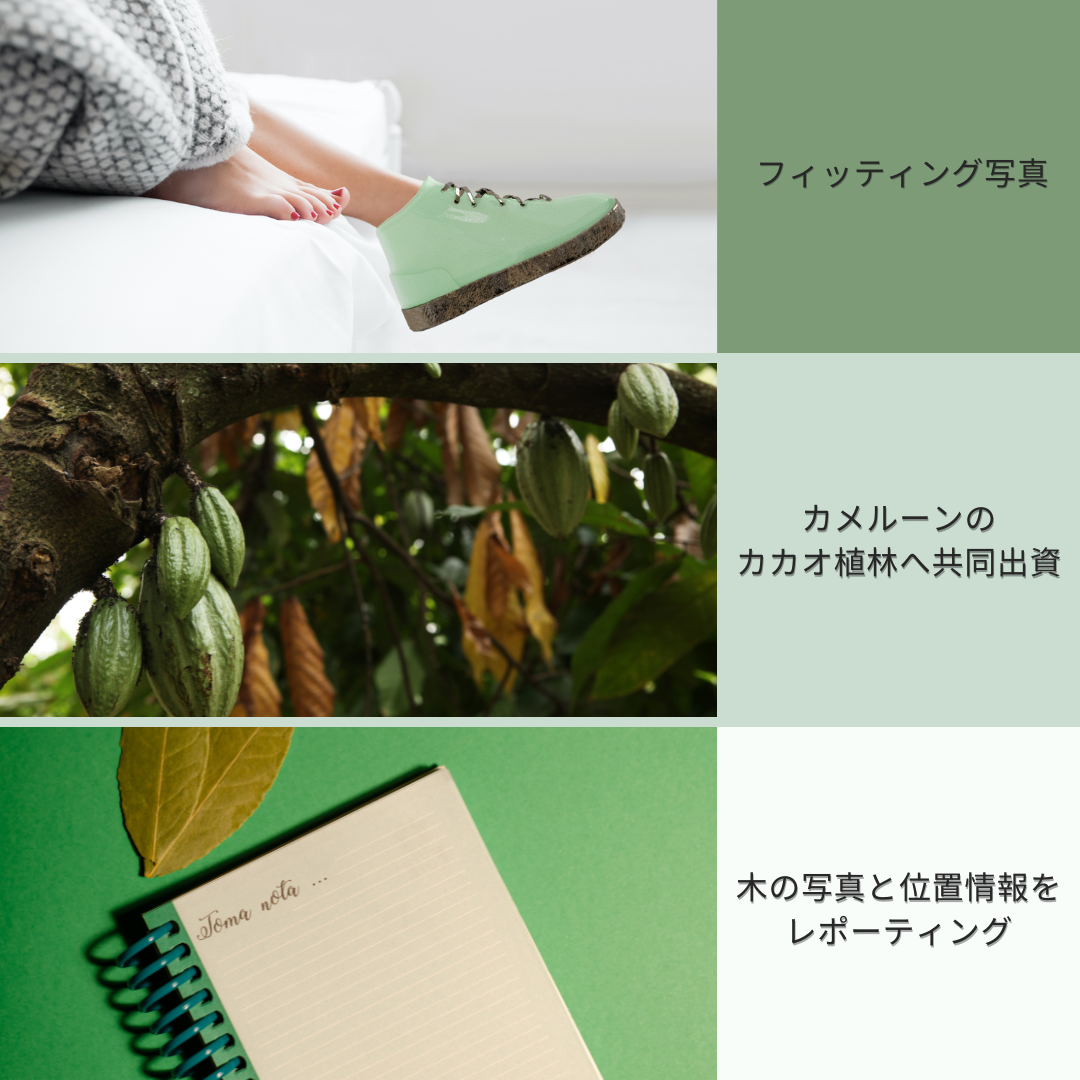 また、購入代金の一部はカメルーンのカカオ植林への共同出資金*1となり、1足につき11kgのCO2吸収へ直接貢献できます*2。