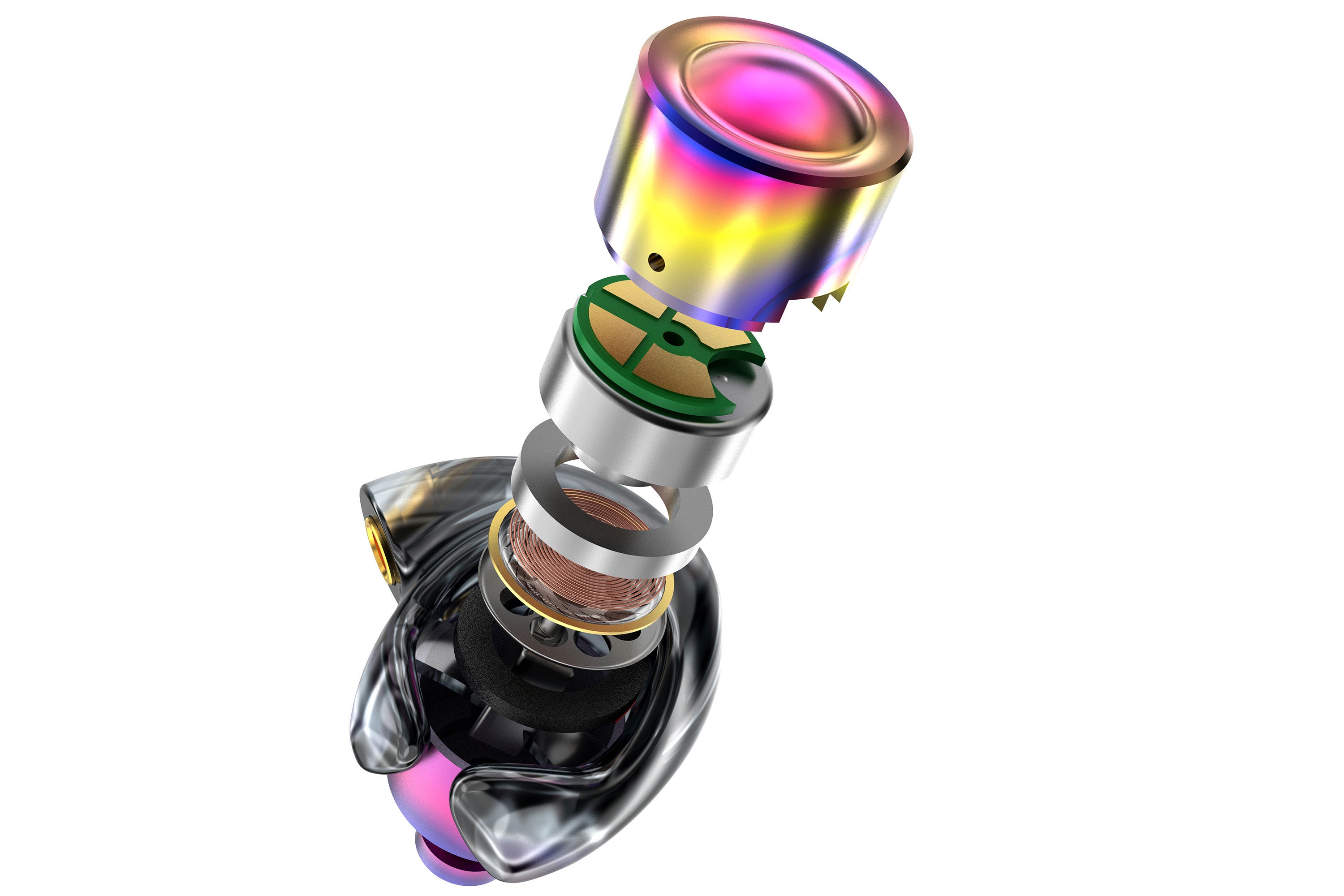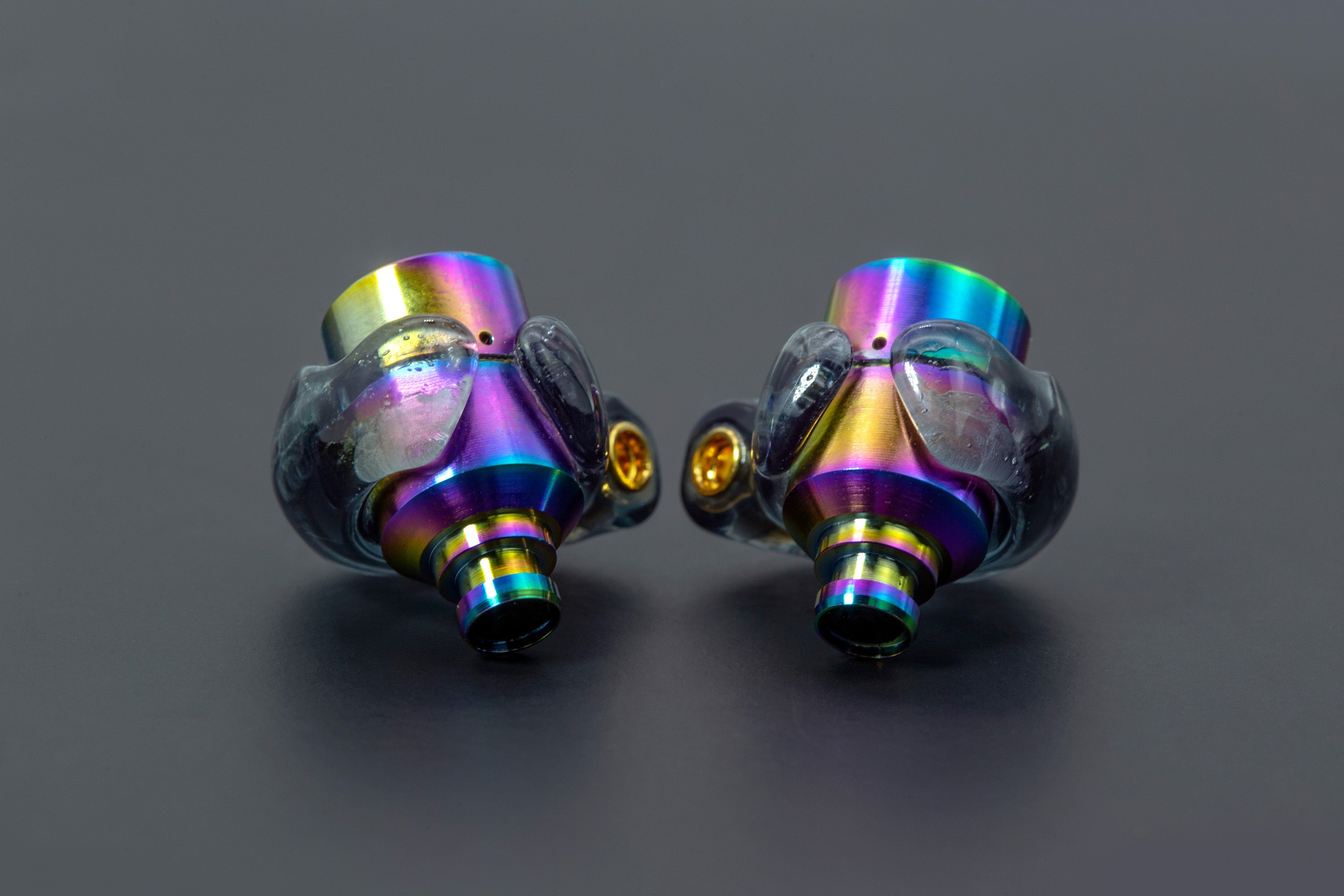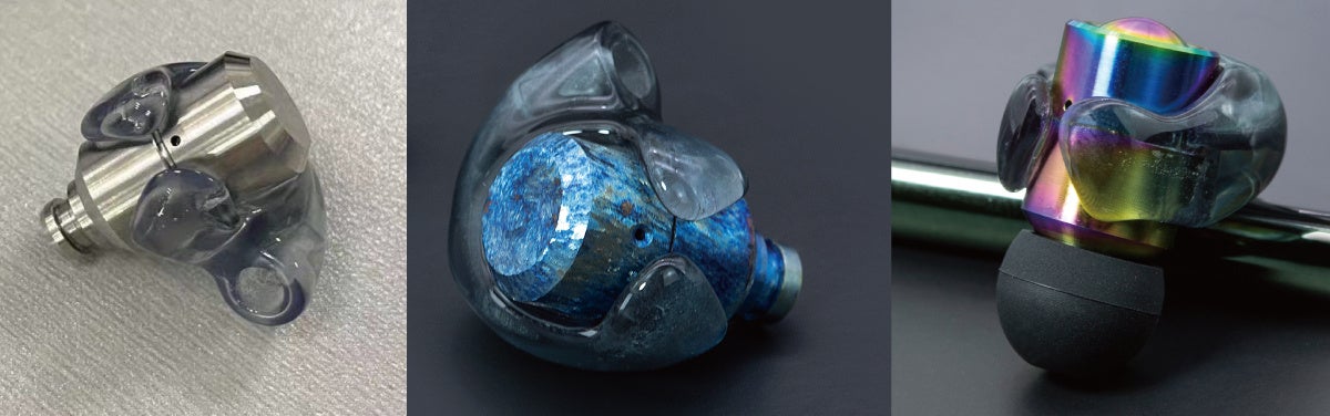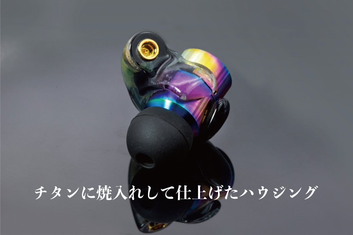 軽くて丈夫な素材のチタンですが、イヤホンのハウジングとして採用されるケースはこれまでもありました。私たちは、チタンを加工すると玉虫色に色が変化する特性を使ったイヤホンが市場にほとんどない(おそらく無い)と思い、透明なレジンでチタン部分を挟むようなデザインで一部チタン部分が見えるようなデザインにこだわりました。