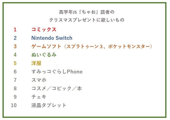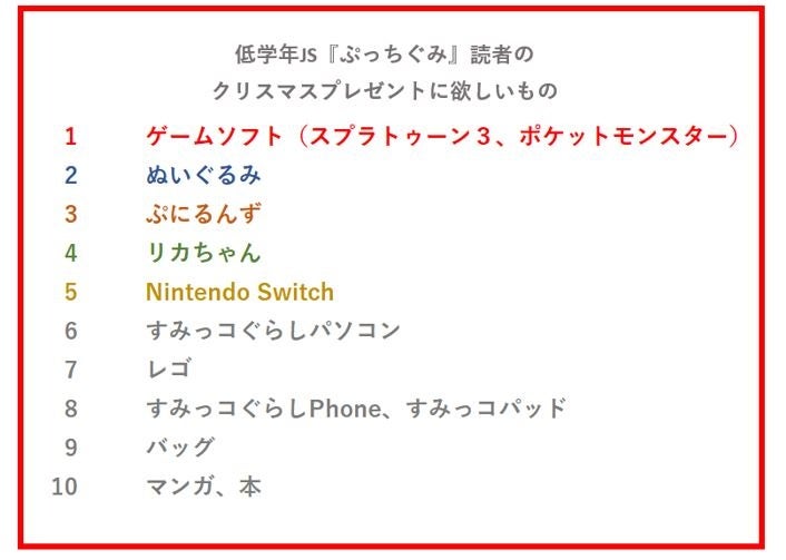 クリスマス本番の1か月前から、すでにしっかりと欲しいプレゼントを決めているという回答の中では、ペットや家電からキャラクターグッズまでさまざま。その中でも『ぷっちぐみ』読者の人気NO.1は「ゲームソフト」。小学校低学年でもゲームを『ちゃお』読者の人気NO.1は「コミックス」という結果になりました。他にも「Nintendo Switch」も上位にランクインしていることがしていることからゲーム人気が高いことがわかります。